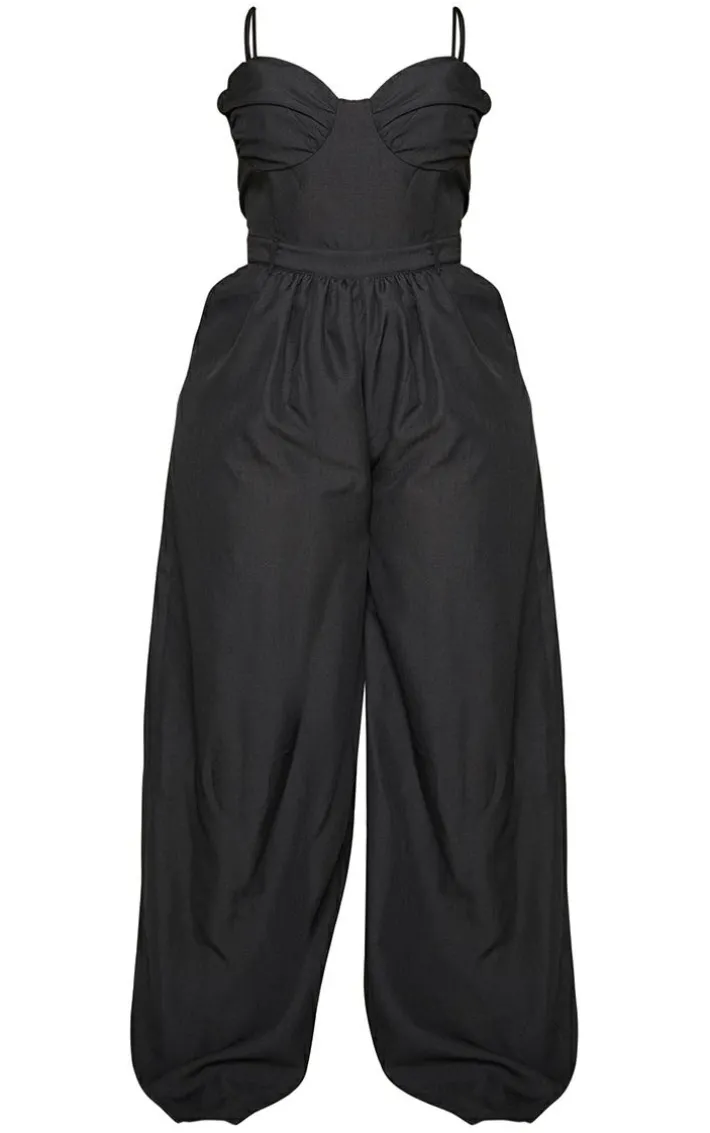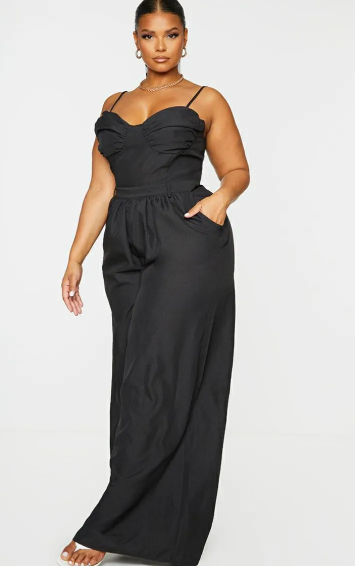 Switch up your look with this jumpsuit. Featuring a black material with ruched cup detailing and a wide leg fit, what’s not to love? Style with a statement belt, strappy heels and gold accessories for a chic finish.