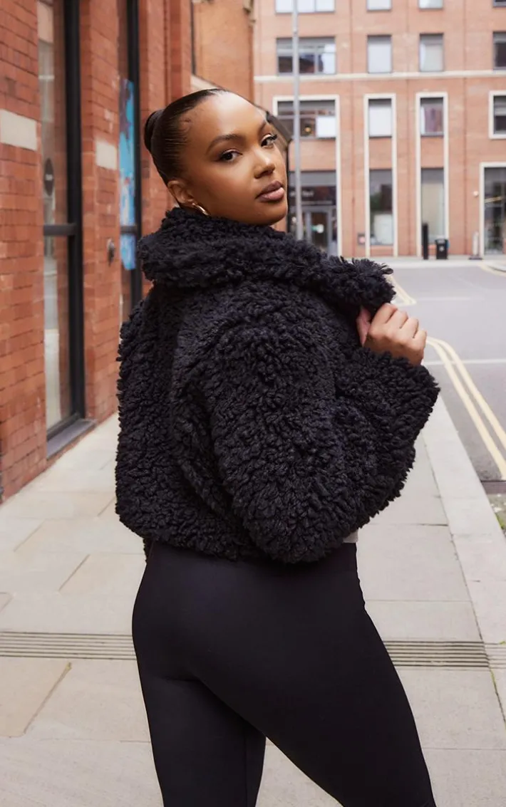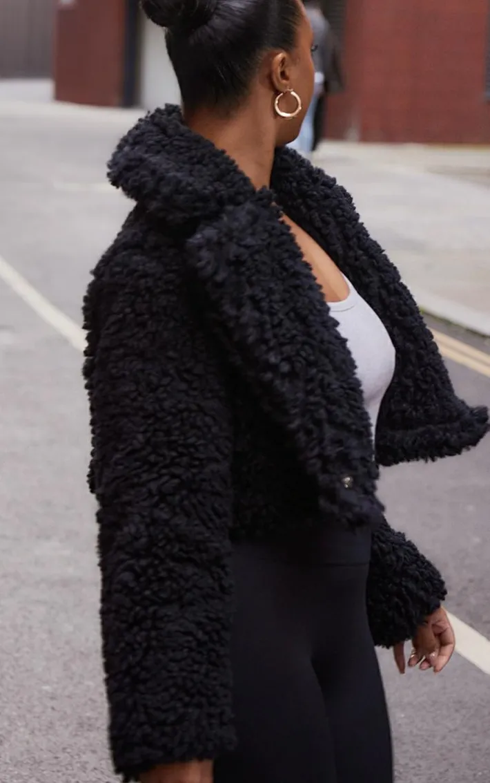 Keep your look cosy but chic this season with this plus black teddy faux fur cropped coat, we’re seriously in love. Brought to you in a black teddy faux fur material with a cropped length and a relaxed fit, you’ll be earning all the likes in this plus coat. Pair it with some leggings, chunky sneakers and gold hoop earrings for a look everyone will want.
