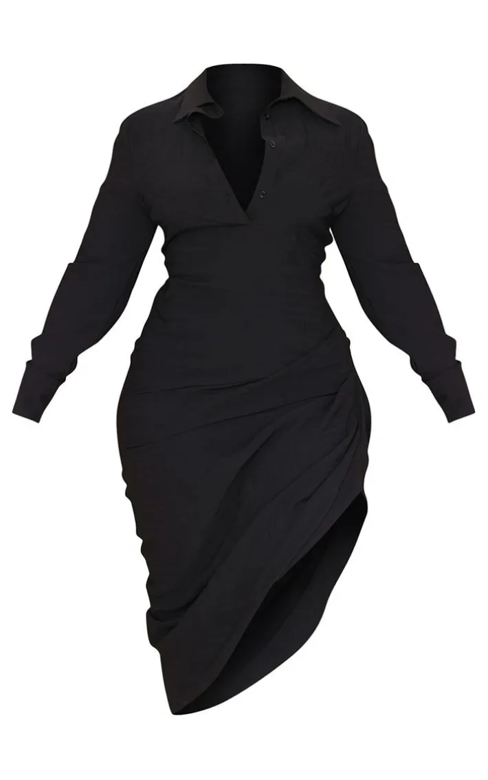 This dress is giving us all the luxe vibes for your weekend wardrobe. Featuring a black textured material with a ruched side design and a midi length. We love this paired with tie-up heels and your fave accessories.