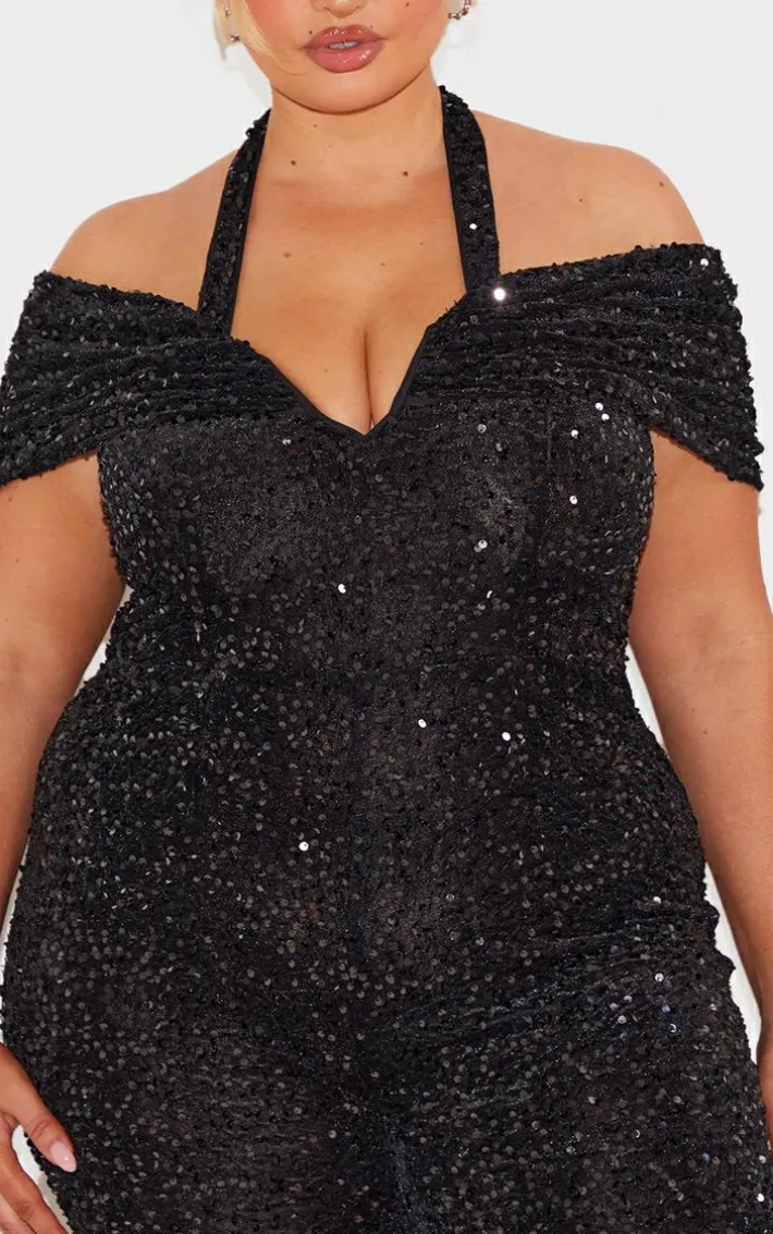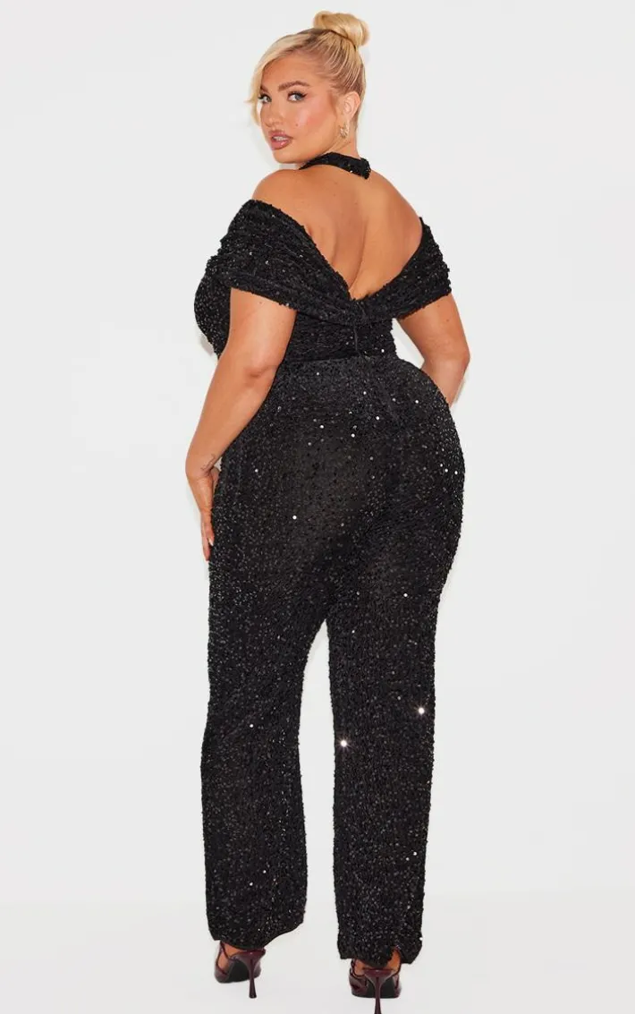 Introducing your new events season staple with this plus black velour sequined bardot halter neck strap jumpsuit. Made from a black hue velour material with a sequined detail, bardot design and halter neck strap feature, this jumpsuit is a must have. Team with black courts and your fave accessories to elevate the look. Reach for this jumpsuit next weekend.