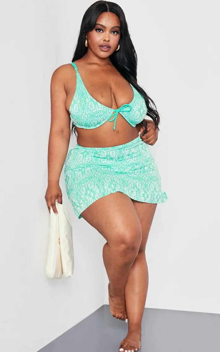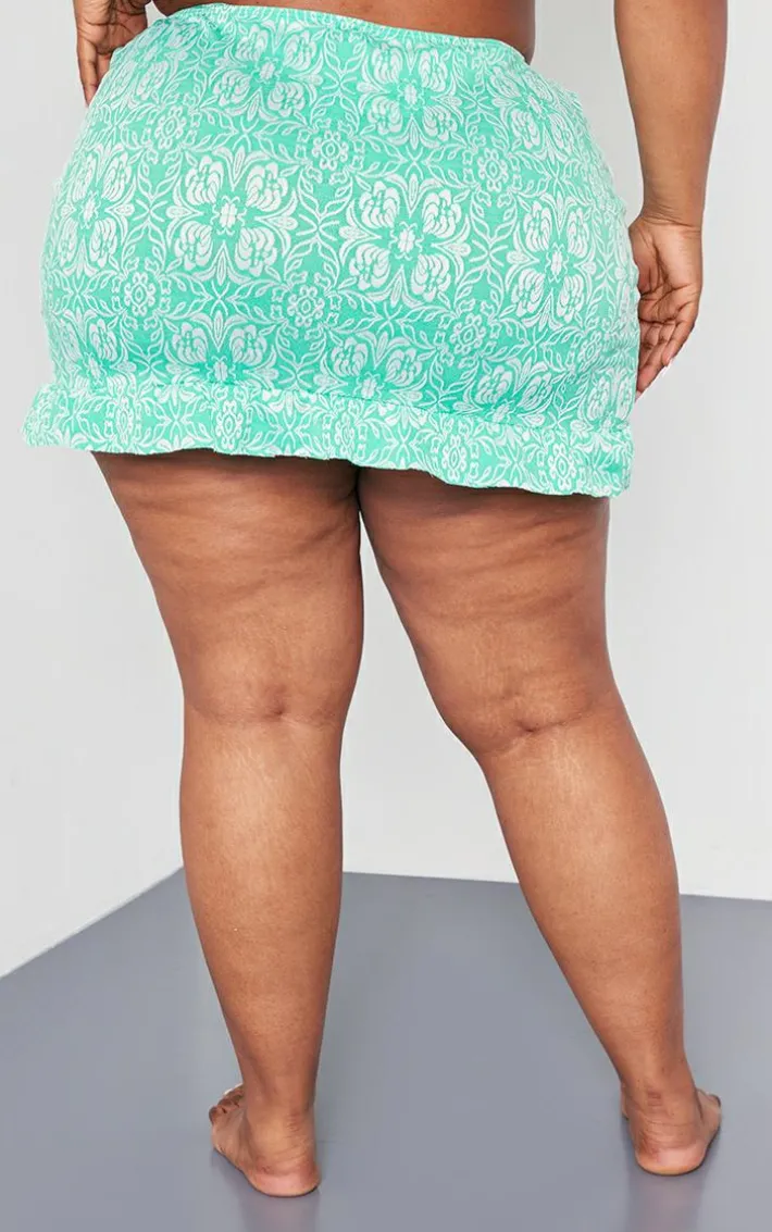 Elevate any beach look with this plus bright green floral ruffle beach skirt. This skirt is made from a bright green material with a floral design for a feminine look we are obsessing over. With a ruffle detail, you will be standing out from the rest. Team with the matching bikini and your fave accessories to make them stop and stare no matter the occasion.
