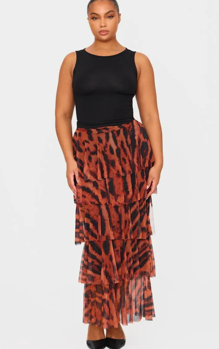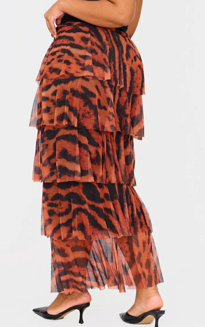 Take a chance on this plus brown animal printed mesh rara skirt for a look you’ll be reaching for again and again. Brought to you in a rich brown shade, with a statement animal printed design, mesh material and must have rara style, this maxi skirt was made to be seen. Team with a black top and court heels to let the skirt speak for itself.