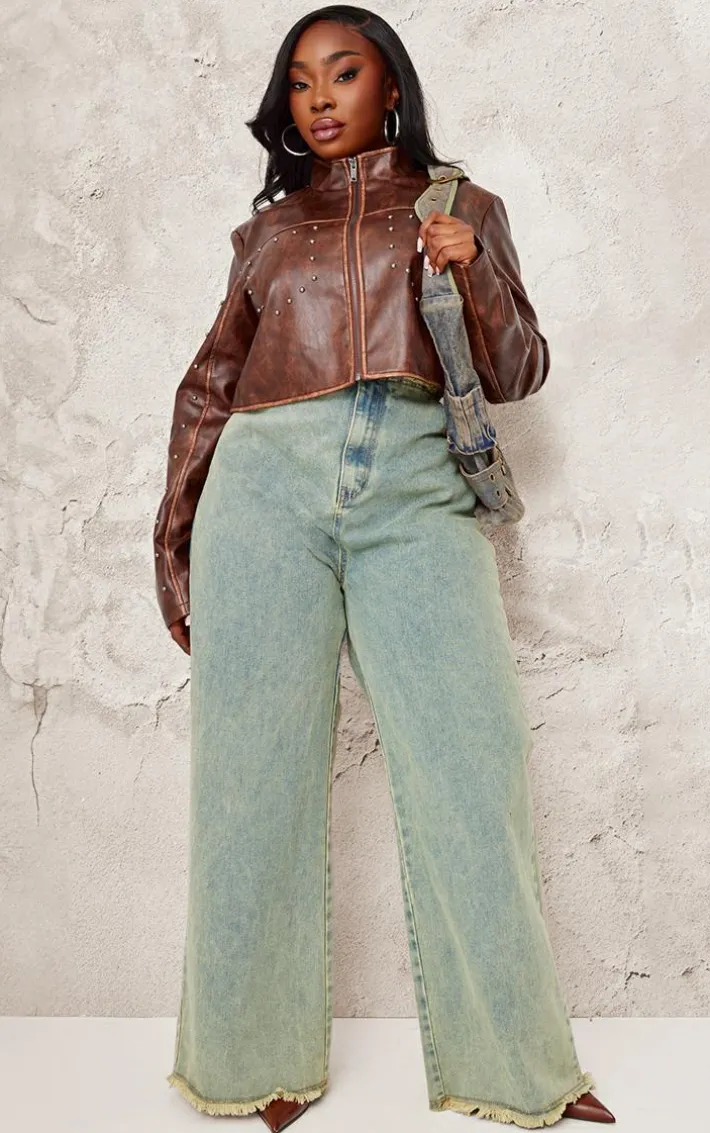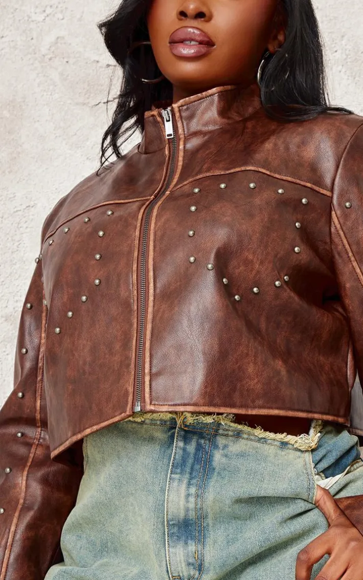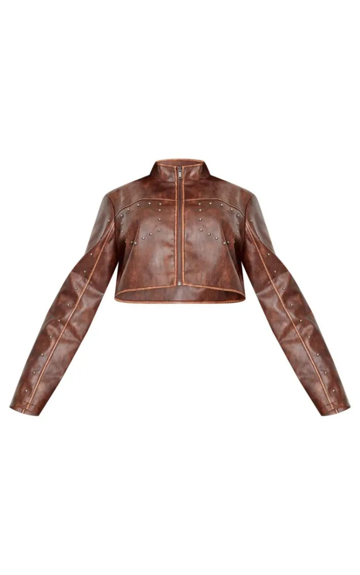 Make styling easy this season with this plus brown faux leather studded cropped jacket. Brought to you in a brown hue faux leather material with a studded detail and cropped length, this jacket is all the new you need. Team with blue jeans, slip on heels and a distressed mini bag for an edgy look that won’t go unnoticed.