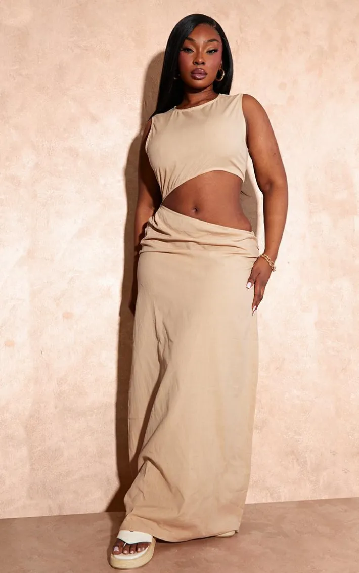 Be the best dressed for any occasion in this plus brown linen look one shoulder O ring detail maxi dress. Brought to you in a brown linen look material with an O-ring detail and a maxi length, we’re in love with this plus dress. Style this maxi dress with white sandals and gold accessories for a look we’re obsessing over this season.