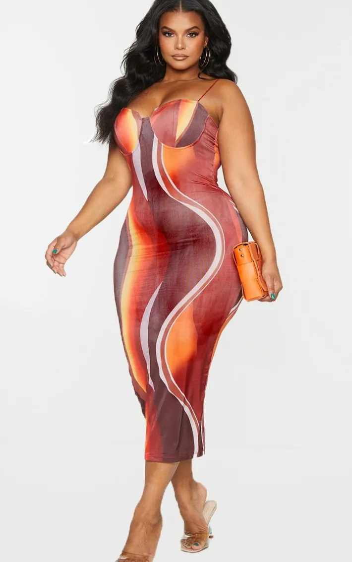 Add some fiercely feminine vibes to your weekend look with this dress. Featuring a brown ombre material with a striped pattern, cup detailing and a midi length. We are loving this paired with strappy heels and a mini bag.