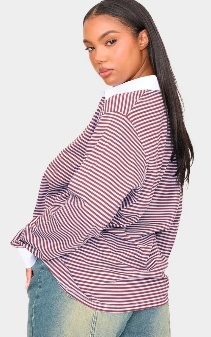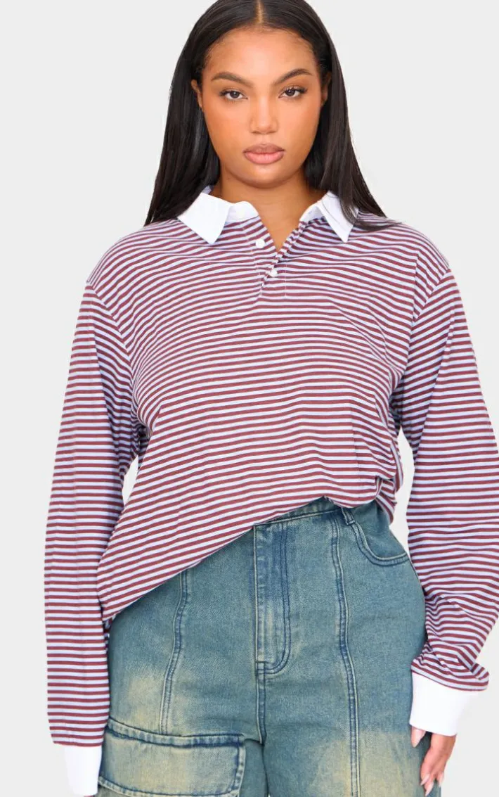 Opt for this plus burgundy striped collared oversized long sleeve T shirt to solve your ‘what to wear’ dilemmas. Brought to you in a seasonal burgundy tone, with a striped design and collared detail, this T shirt is all the new you need in your basics collection. Style with a pair of jeans and minimal accessories to really make an impact.
