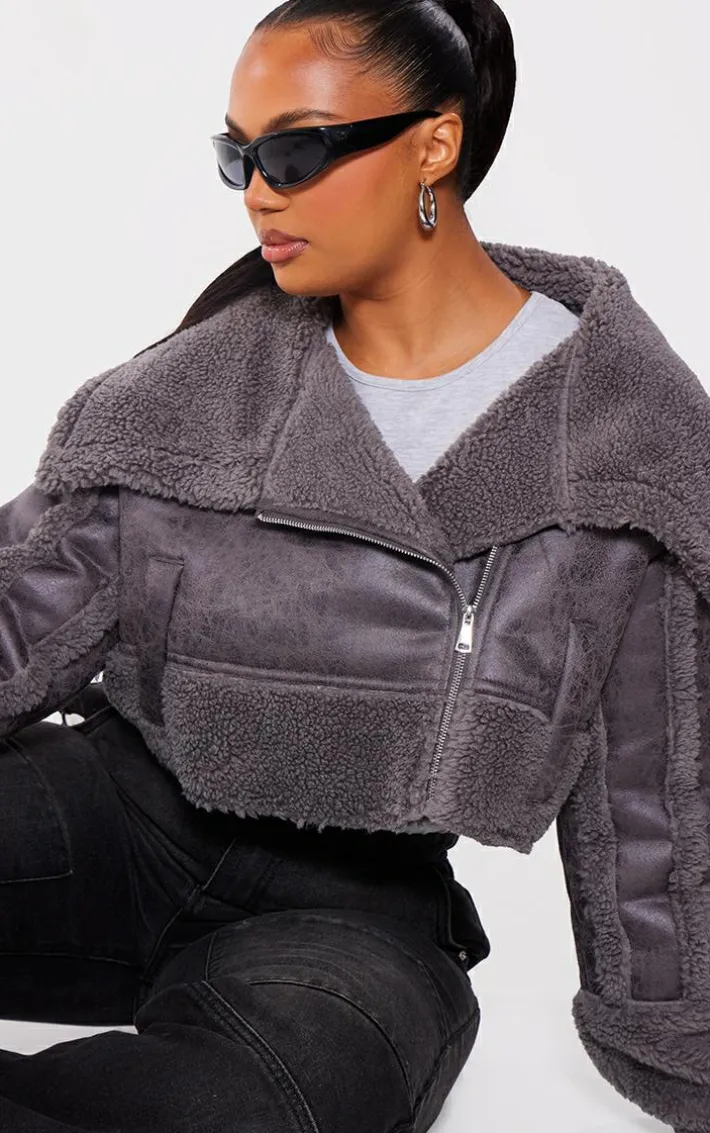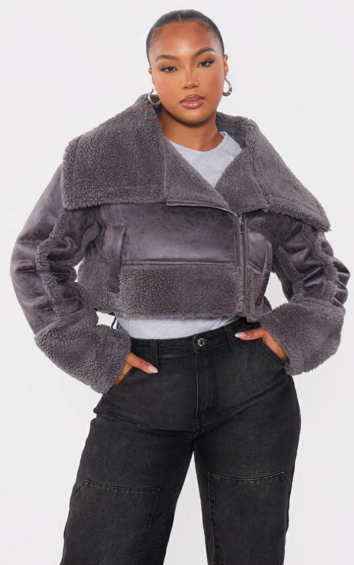 Upgrade your outfit of the day this season with this plus charcoal grey faux suede borg trim aviator and you are sure to earn all the style points. With a charcoal grey faux suede material, borg trim lining and a cropped length, what more could you ask for? This plus aviator has endless styling potential so you’ll never have another what-to-wear dilemma again. We are loving it teamed with a maxi skirt, chunky sneakers and a basic top for a fresh off-duty vibe.
