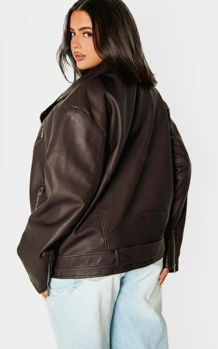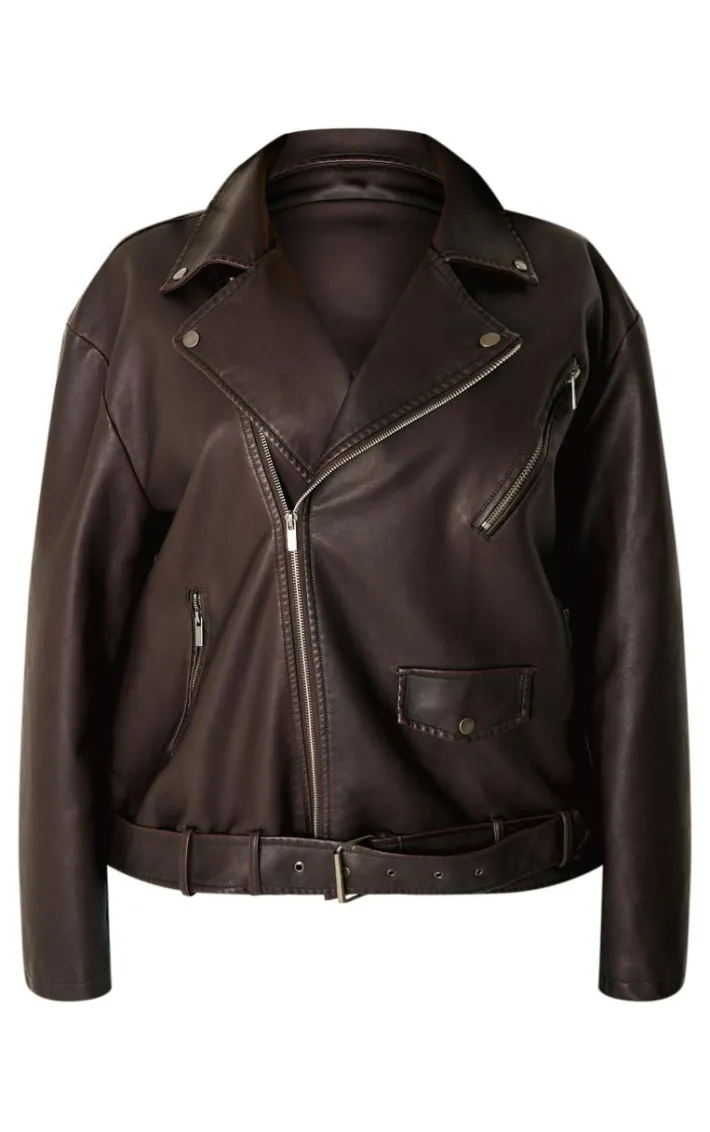 Elevate your outerwear collection with this plus chocolate distressed look faux leather longline biker jacket. Brought to you in a chocolate hue faux leather material with a distressed look detail and longline design, this biker jacket is all the new you need. Style over a chic outfit of the day with a burgundy shoulder bag for a look like no other.