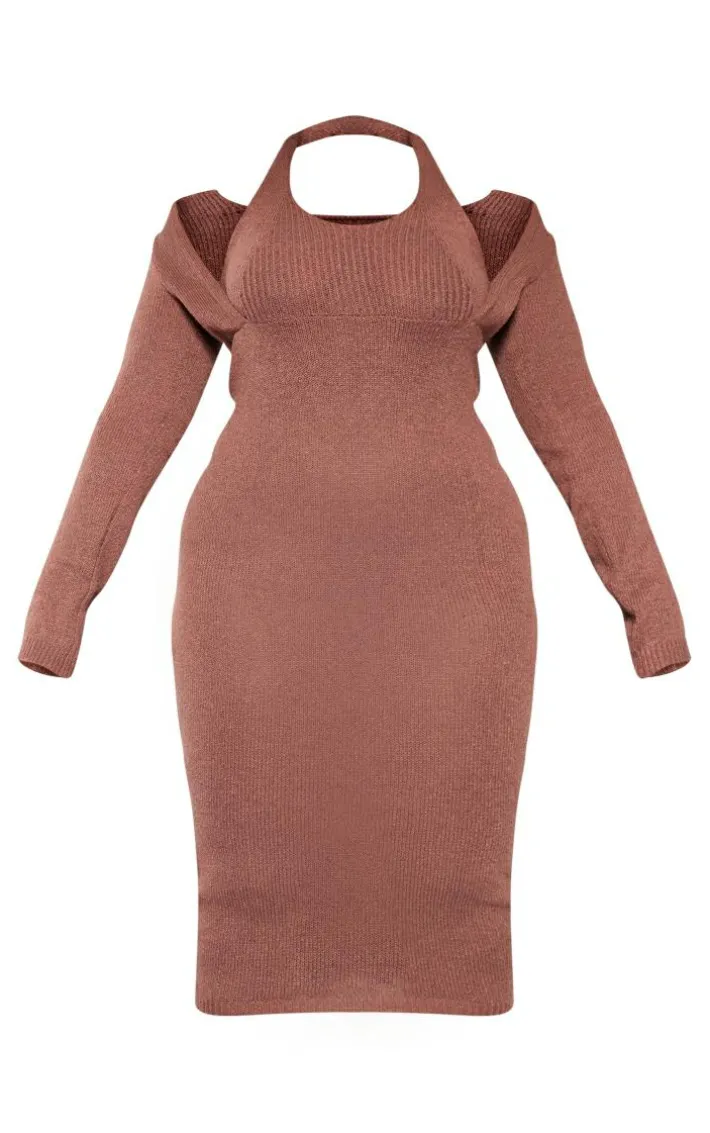 Enter the new season in style with this plus chocolate halterneck knitted midi dress. Brought to you in a chocolate hue knitted material with a halternekc design, long sleeves and a figure-hugging midi fit, how can you say no? Perfect for dressing up or down, this plus dress is sure to be a staple in your wardrobe. Just add heels and gold accessories to elevate the look.