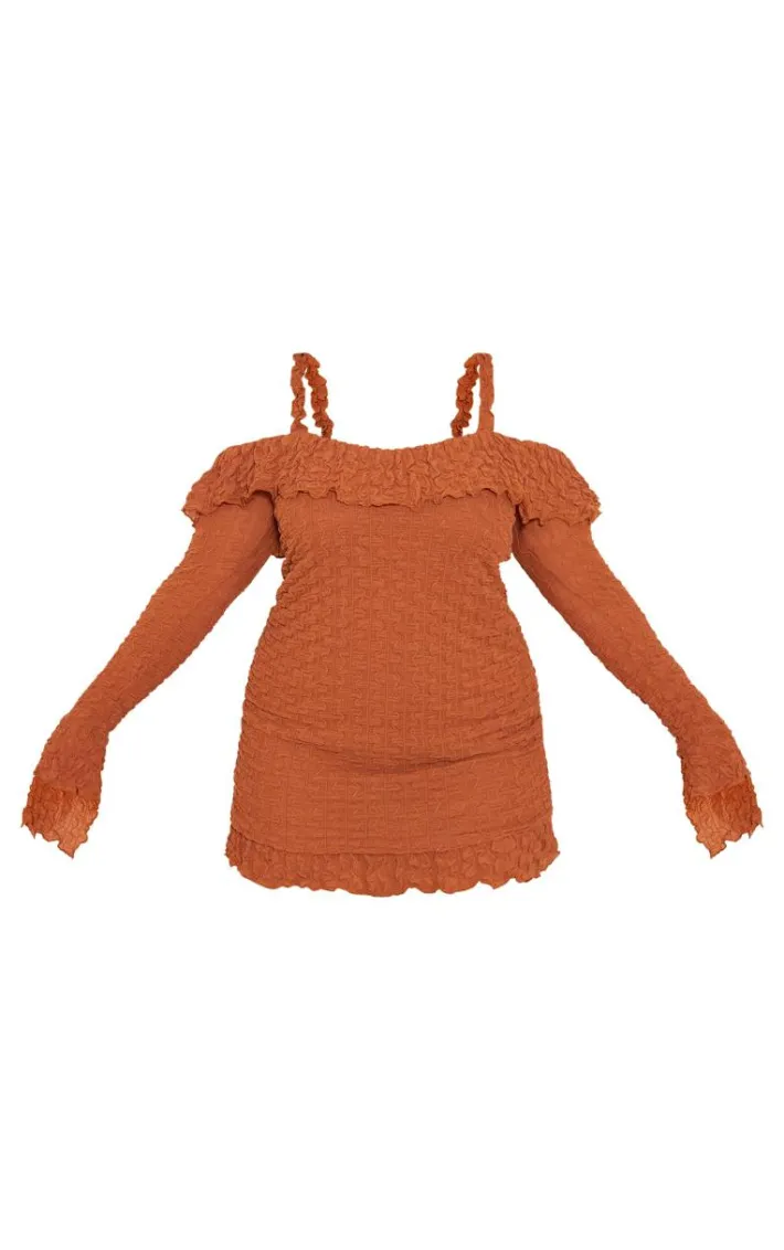 Create a look no one will forget with this plus chocolate textured bardot frill hem bodycon dress. Brought to you in a chocolate textured material with a frill hem and a figure-hugging fit, this bodycon dress will have you standing out from the rest. Style with clear slip-on heels and accessories for a combo we’re crushing on.