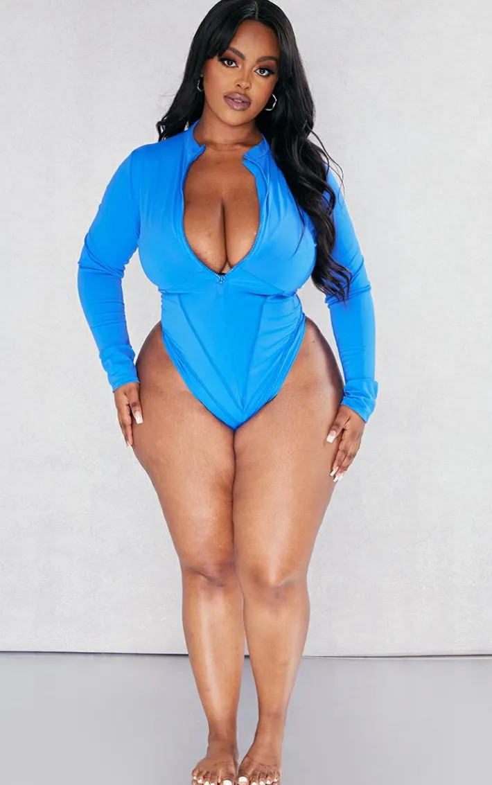 Dare to stand out from the crowd in this statement plus cobalt zip up seam detail long sleeve swimsuit, it is a must-have for those beach days and beyond. With a cobalt hue material, a zip up design, seam detailing and long sleeves, you’re sure to be adding this bold piece straight to your basket, it’s a definite yes from us. Team with your fave shades and gold hoop earings for a fool proof finish.