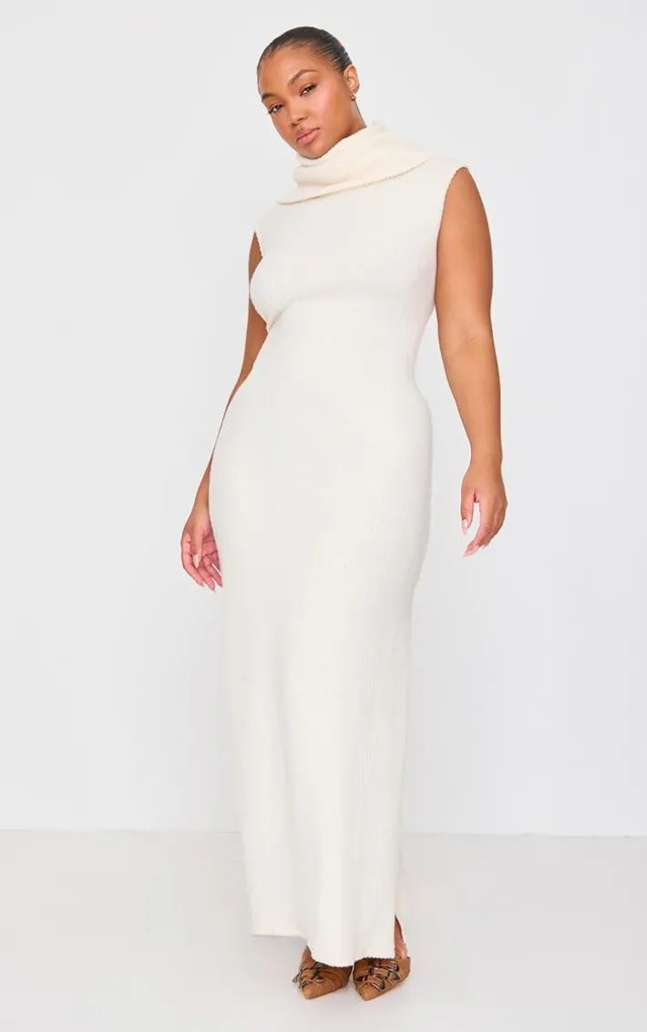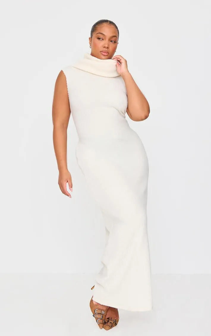 Own the night in this plus cream brushed rib roll neck maxi dress. Brought to you in a cream hue brushed rib material with a roll neck design, this maxi dress is a must have for your new season wardrobe. How can you resist? Style with slip on heels and gold accessories for a look that’s sure to turn heads.
