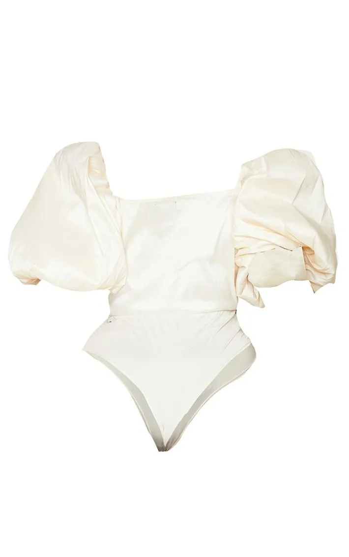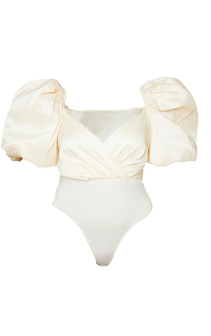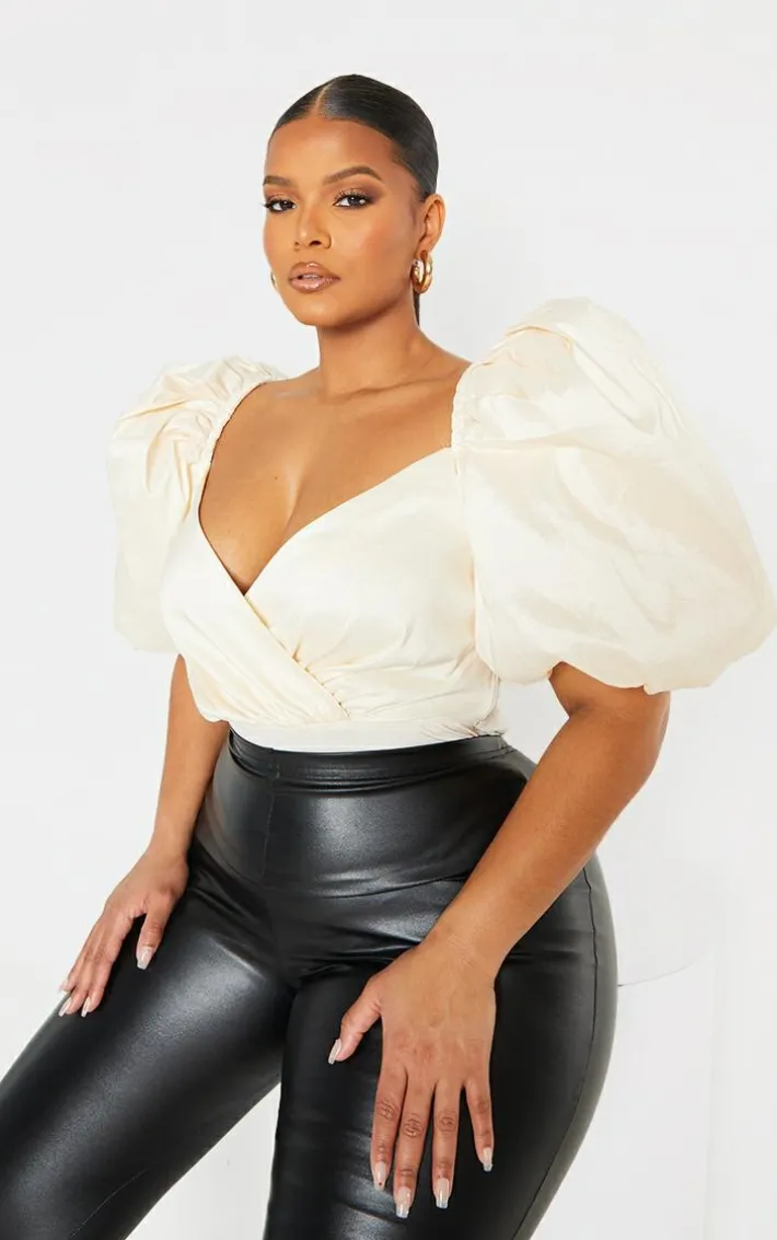 Your weekend look is finally sorted with this bodysuit. Featuring a cream material with extreme puff sleeves and a plunging neckline. We’re loving this with faux leather bottoms, heels and a mini bag to complete the look.