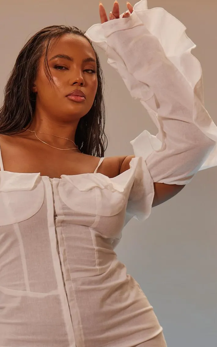 Take your new season look to a whole new level with this plus cream linen look frill bardot bodycon dress. Brought to you in an cream linen look material with frill detailing and a figure-hugging, how can you resist? Style this with heels and accessories for a look that is sure to make heads turn for all the right reasons.