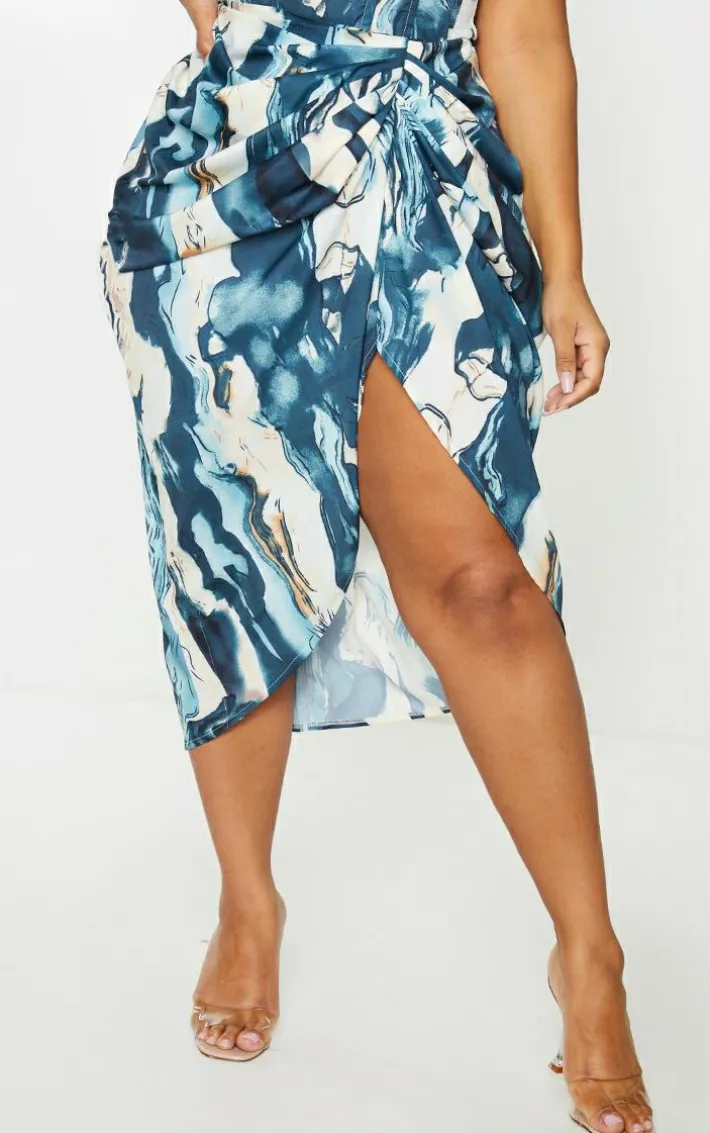 Take your look to new heights with this midi skirt. Featuring a cream marble print material with ruched detailing, a thigh-high split and a midi length. Style this with the matching bodysuit and barely-there heels to complete the look.