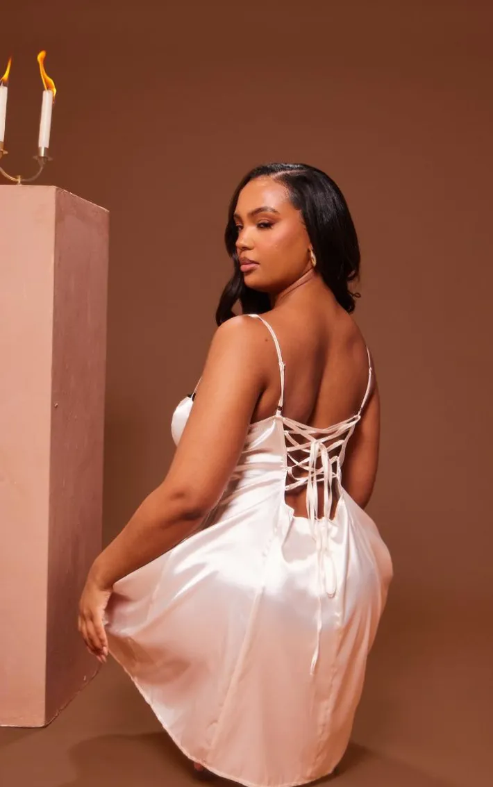 You are guaranteed to steal all the stares in this plus cream satin contrast lace cup detail shift dress. Brought to you in a cream hue satin material with a contrasting lace design, cup detailing and a shift style, how can you not fall in love? Simply add your highest heels and some luxe accessories to take your look to a whole new level.