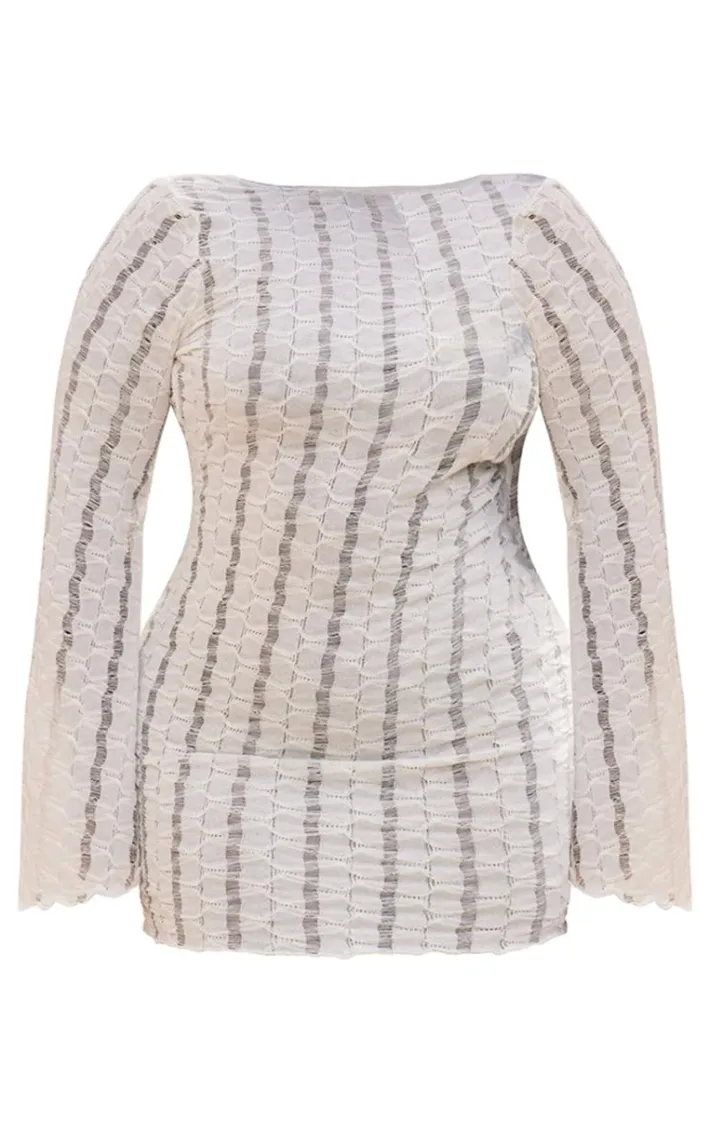 Make heads turn for all the right reasons in this plus cream textured laddered flare sleeve scoop back shift dress. Brought to you in a cream textured material with long flare sleeves, laddered detailing and a scoop back design, what more could you want? Style this cream shift dress with heels and statement gold accessories for a chic finishing touch.