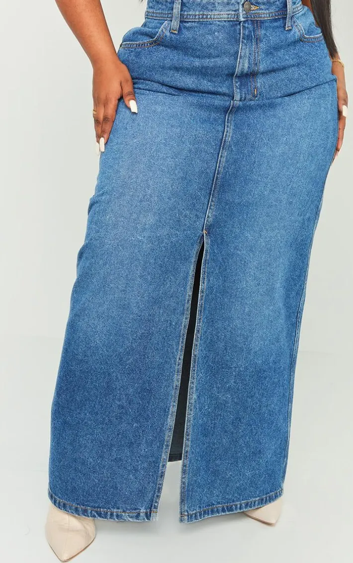 Be sure to nail new season trends in this plus dark blue wash split front denim maxi skirt. Brought to you in a dark blue wash denim material with a split front design and a maxi length, how can you say no? Perfect for dressing up or down to suit any occasion, you will be reaching for this denim skirt again and again. Style with a high neck top and heeled boots to shop the look we’re loving.