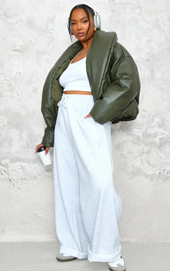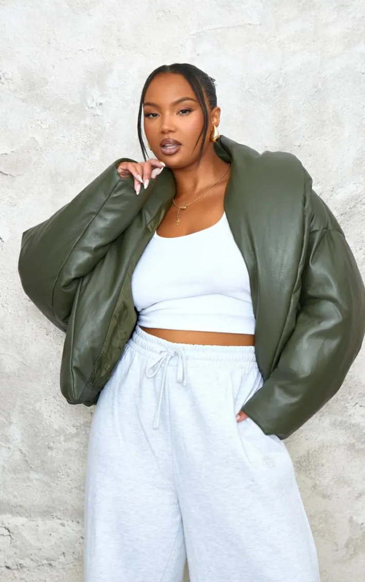 Say hello to your new season staple with this plus dark khaki exaggerated collar PU cropped puffer coat. Brought to you in a dark khaki PU material with an exaggerated collar design and a cropped length, this puffer coat is all you need to feel comfy this season. Team with some simple accessories and a pair of grey sweatpants an off-duty look we are loving.