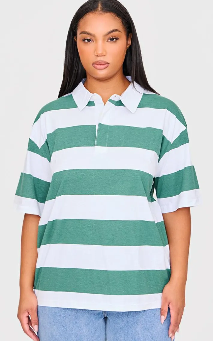 We’re loving this plus green chunky striped collared oversized T shirt for the ultimate day time look. Brought to you in a statement green shade, with a luxe chunky striped design and collared detail, this T shirt is a must have. Style with a pair of jeans and sneakers to finish off the look.