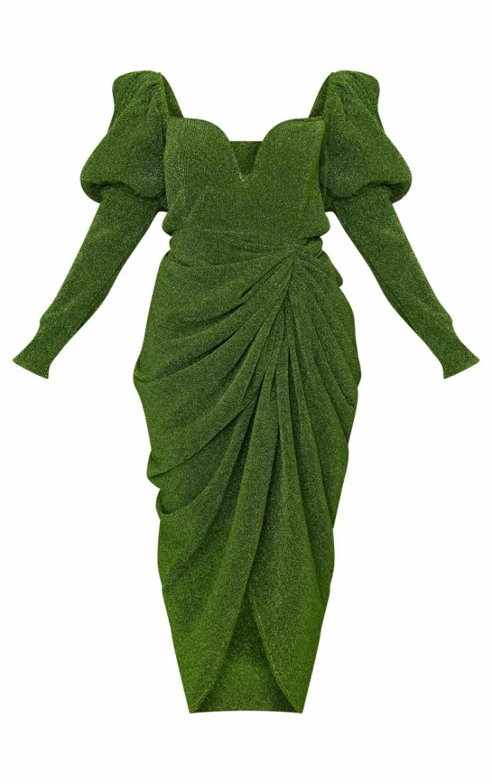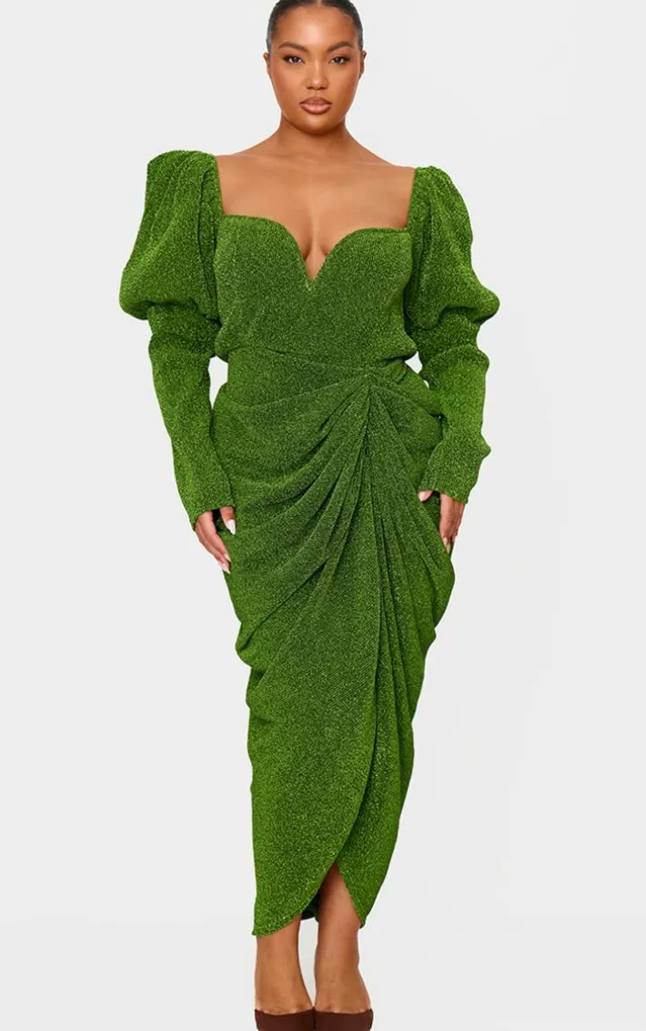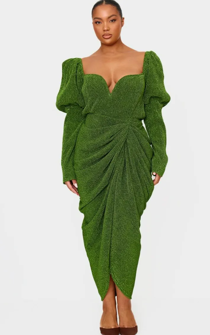 Step out in style with this plus green glitter plisse puff sleeve V bar draped midi dress. Brought to you in a green glitter plisse material with a puff sleeve design and a v bar detail, we are seriously obsessed. This draped midi dress is all you need to feel effortlessly glam. Team with some of your highest heels and a statement bag for a look that will turn heads for all the right reasons.