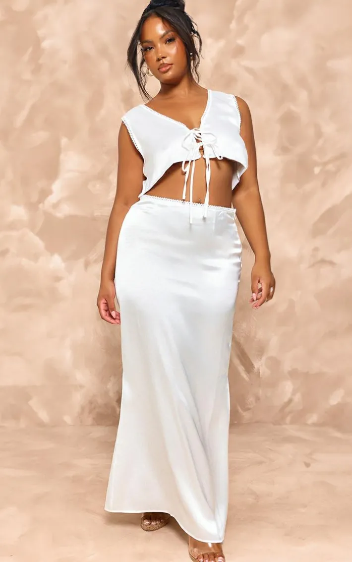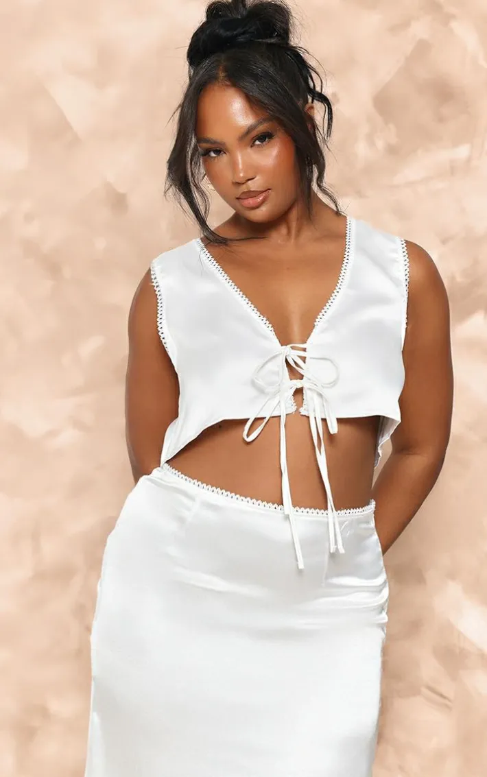 When the weekend calls so does this plus ivory satin tie front V neck top. Brought to you in a ivory hue satin material with a tie front fastening and V neck design, this top is a must have. How can you not fall in love? Style with the matching top, white heels and gold accessories for a flattering finish we can’t stop staring at.