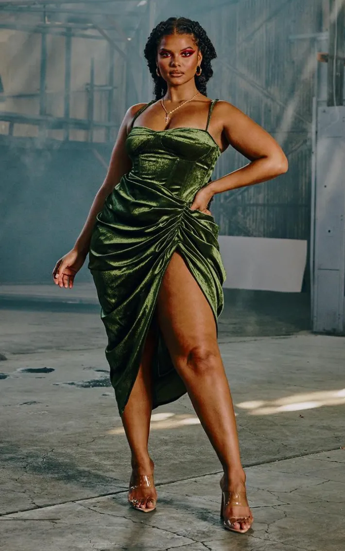 This skirt will take your look from 0-100. Featuring an emerald khaki fabric with ruched side detailing and a midi length, team this with the matching top and heels for a luxurious combo.