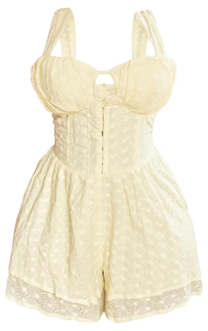 Take on your weekend the right way with this statement plus lemon broderie hook and eye romper. Made from a lemon broderie material with a hook and eye detail, this is everything we’re loving and more. With It’s figure-hugging fit this romper is sure to hug you in all the right places. To complete the look style this seamlessly with your fave accessories and a pair of nude heels for a look that will secure you all the likes.