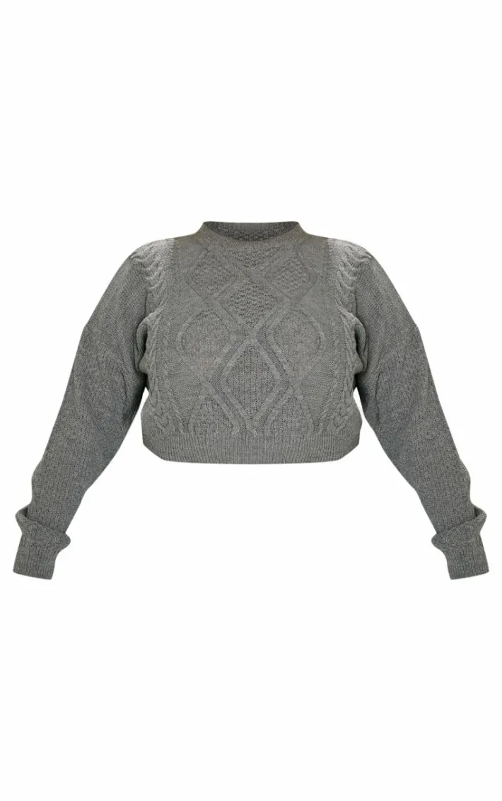 Keep it chilled with this plus light grey cable cropped sweater. Brought to you in a light grey material with a cable design and a cropped length, you are sure to set trends with this unreal sweater. Team with your fave jeans and a statement bag for a look you wont be able to resist.