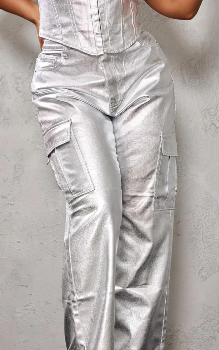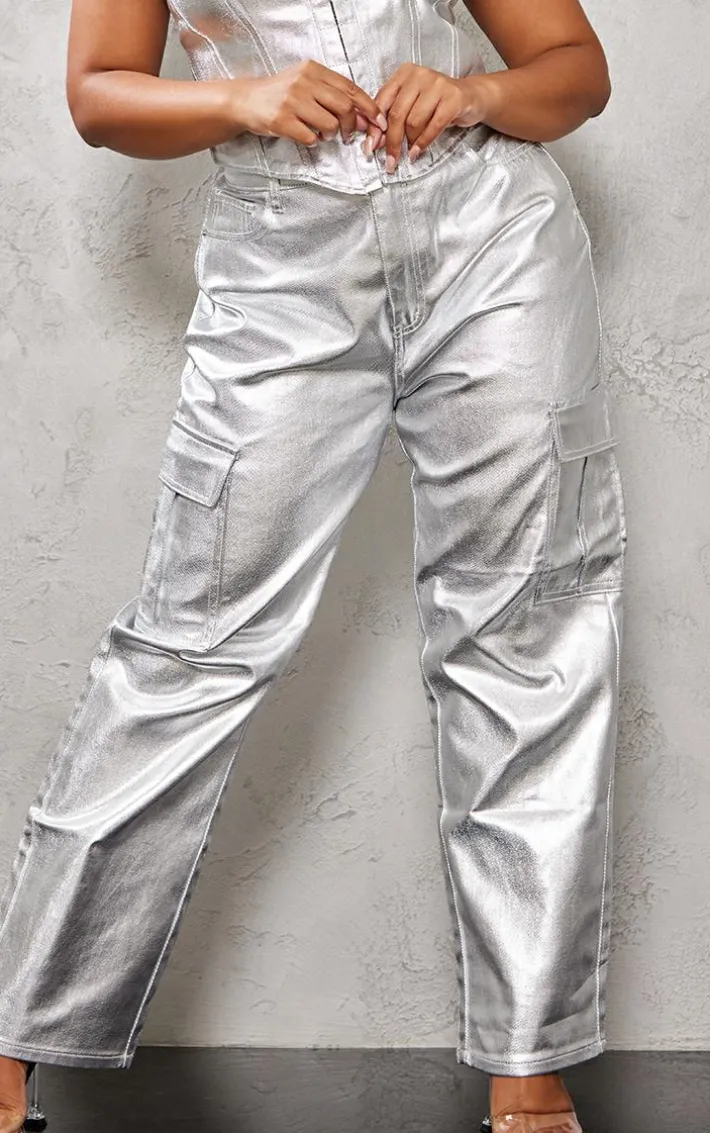 Dare to stand out from the crowd in these plus metallic coated denim cargo jeans, they’re a definite yes from us. With a metallic coated denim material, a cargo style and a figure-flattering, these plus jeans will earn you all the likes. Team these plus cargo jeans with the matching corset, clear slip-on heels and gold hoop earrings for a look we just can’t get enough of.