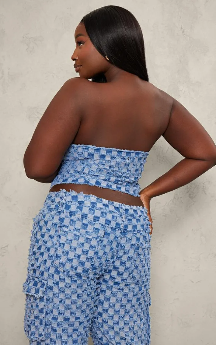 Add a little edge to your new season wardrobe with this plus mid blue wash fray detail checkered denim bandeau top, we’re obsessed. This plus top features a mid blue wash denim material with a frayed checkered design and a button front style. Pair with the matching jeans, sneakers and a shoulder bag for a look everyone will want.