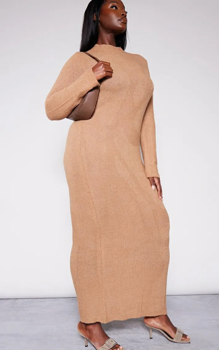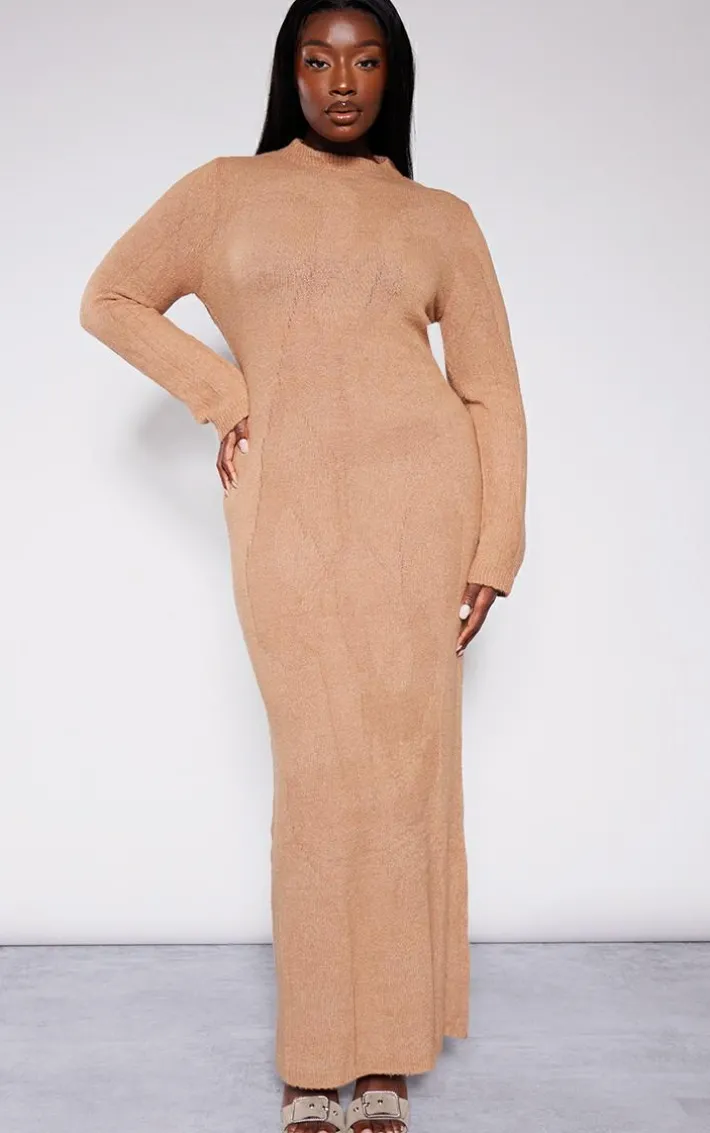Take the stress out of weekend styling with this unreal plus mocha soft knit open back long sleeve maxi dress. Brought to you in a mocha soft knit material with an open back, long sleeves and a figure-hugging fit, you really can’t go wrong with this maxi dress. Style with clear strap heels and gold accessories for a look that will have eyes on you for all the right reasons.