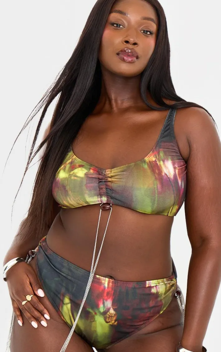 When the vacay calls so does this plus multi abstract print chain detail bikini top. Brought to you in a multi hue abstract print material with a chain detail, this bikini top is everything you need and more. Style with the matching bottoms and your fave pool side accessories to get that spf sizzlin’. It’s a yes from us.
