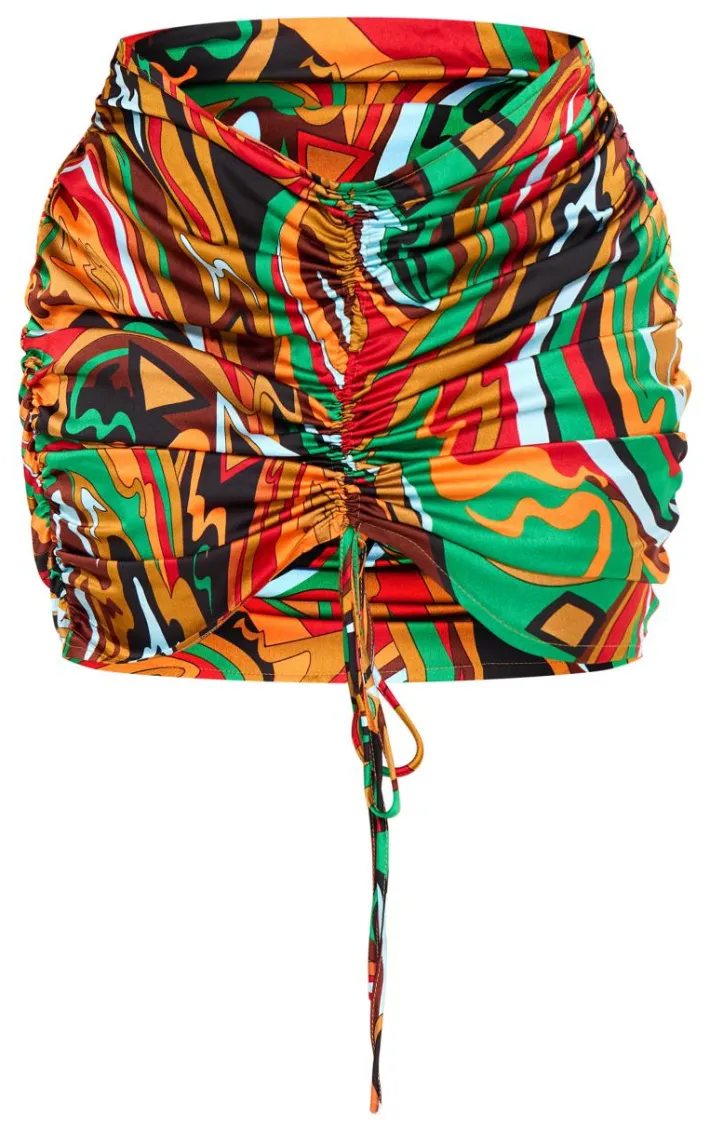 Add some bold prints to your look with this skirt. Featuring a multi hue material with an abstract print and a ruched front design. Team this dreamy skirt with a shirt, heels and a shoulder bag to complete the look.