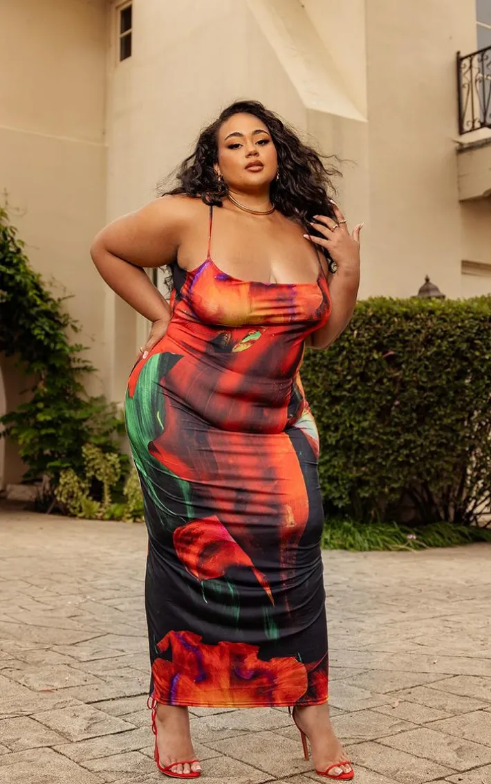 Your wardrobe is calling out for this plus multi printed cowl neck midi dress for your new season look. With a multi printed material and a cowl neck design, how could you resist? You will earn all the likes with this dreamy piece. Team this unreal plus midi dress with a maxi skirt, clear heels and gold accessories for a weekend-worthy finish.