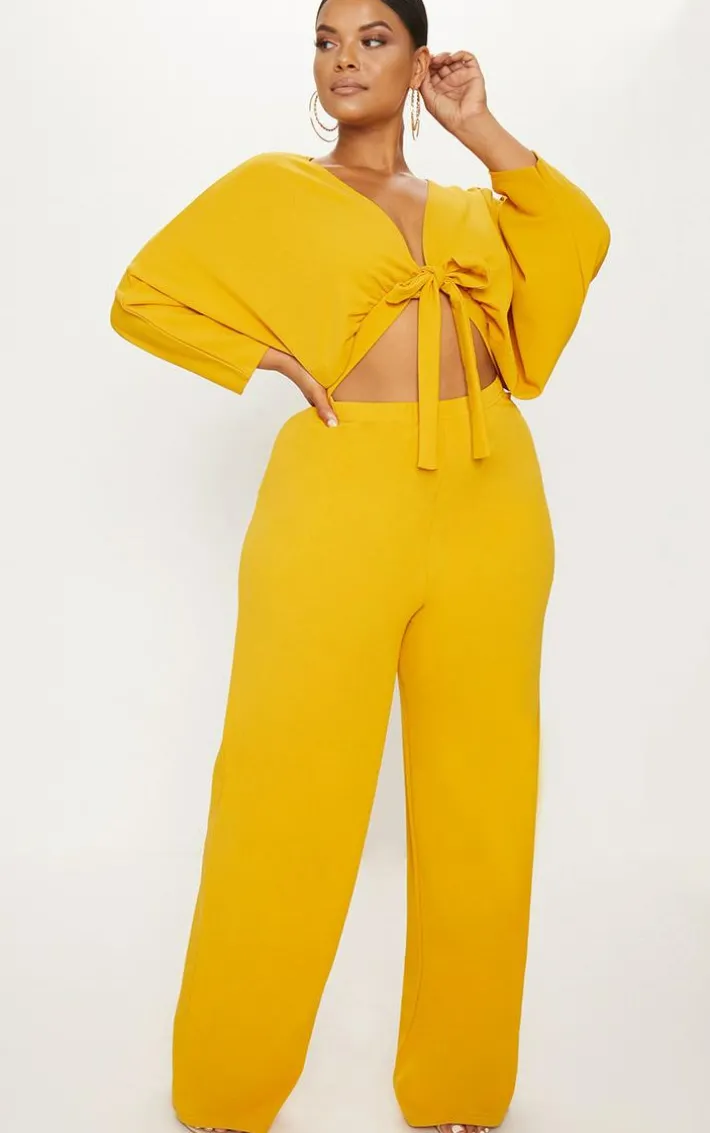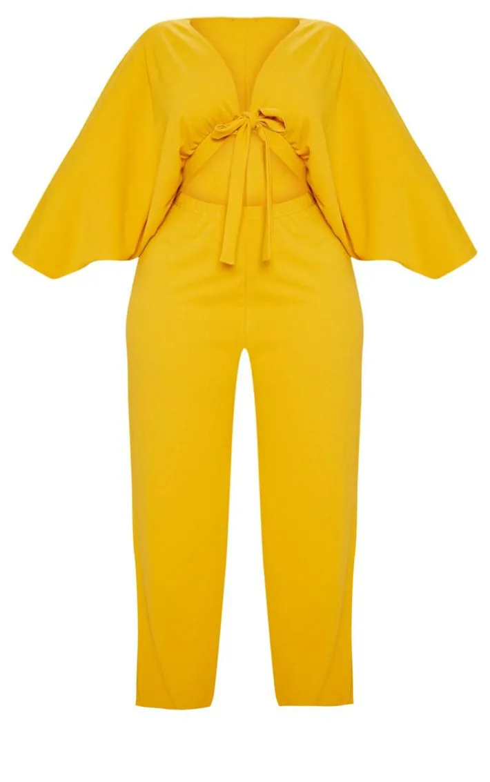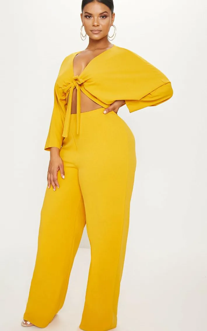 This jumpsuit is everything we are loving right now, with its mustard crepe stretchy material, batwing sleeves and a tie front, team it with some strappy heels and hoop earrings for a simple but chic look.