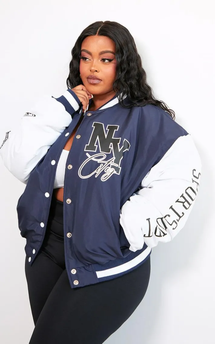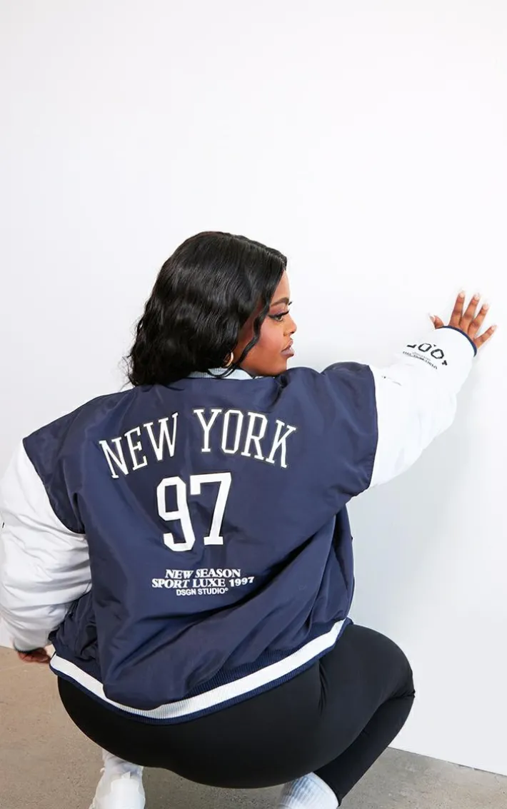 Make sure your new season ‘fit stays on point with this plus navy NY graphic bomber jacket. Brought to you in a navy hue material with a button up front, a ‘NY’ graphic design and a bomber jacket style that we are loving right now, you really can’t go wrong. Style this plus jacket effortlessly over your outfit of the day for a statement finishing touch.