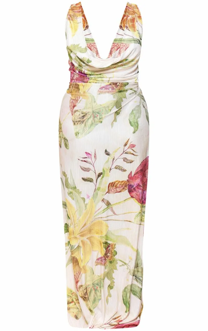 Got an occasion planned? You are guaranteed to be the center of attention in this plus off white floral print plisse cowl plunge maxi dress. Brought to you in an off white plisse material with a dreamy floral print design, a plunging cowl neckline and a flattering maxi length, how can you not fall in love? Style this maxi dress with heels and gold accessories for a look that won’t be forgotten.
