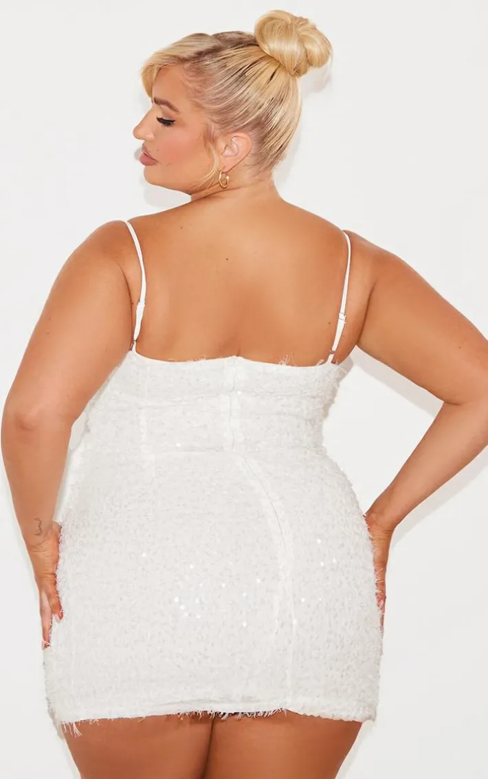 This plus off white sequin feather drape mini dress is here to solve all your what to wear dilemmas. We’re obsessed with its off white hue, feather drape design and glam sequin pattern. Bring the look together with white court heels and your fave jewelry for your next big event. We’ll see you at the party.