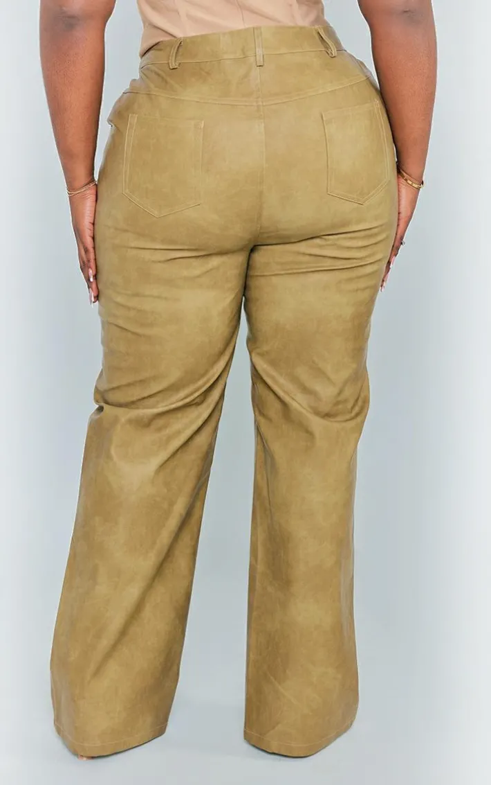 Level up your everyday wardrobe with these plus olive washed faux leather straight leg pants, they’re the perfect piece to take your look from day to night. With an olive hue washed faux leather material, a straight leg design and a figure-flattering fit, you’ll be adding these plus pants straight to your basket. Team these faux leather pants with a basic tee, chunky boots and a tote bag for a cool, off-duty vibe.
