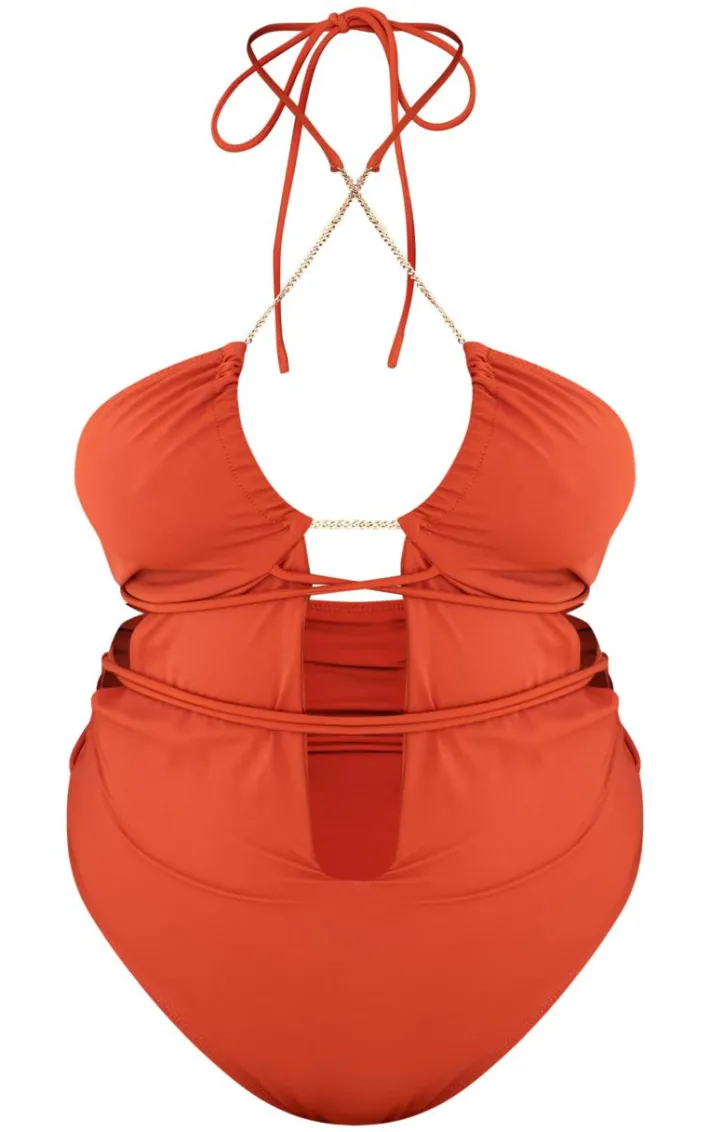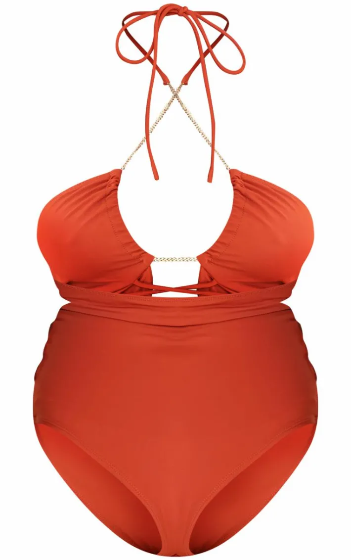 Soak up the sun in style with this plus orange chain detail cut out swimsuit. Brought to you in an orange hue material with a cut out design, chain detailing and a flattering fit, how can you not be obsessed? Style this orange swimsuit with statement gold accessories for a beach look that is sure to make you stand out from the rest.
