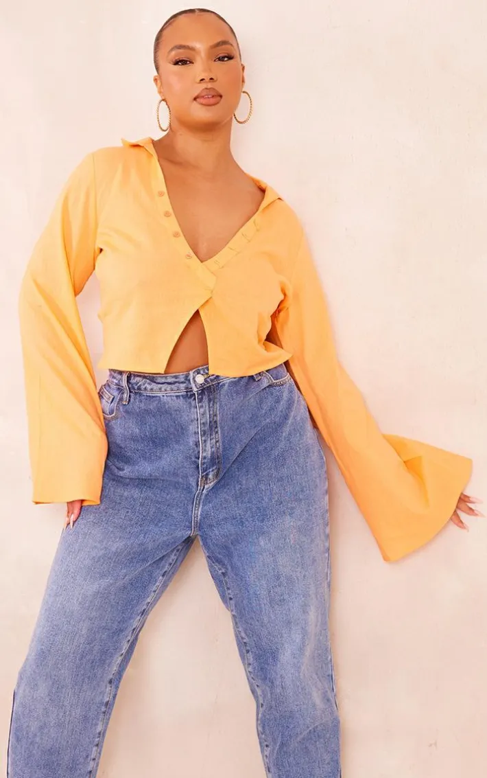 Get ready to add some bold hues to your new season wardrobe with this plus orange linen look long sleeve shirt. Brought to you in an orange hue linen look material with long sleeves and a collar, we just can’t get enough. Style this plus shirt with your go-to pair of jeans, clear strap heels and statement gold accessories for an effortless weekend look worthy of a night out.