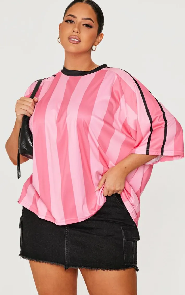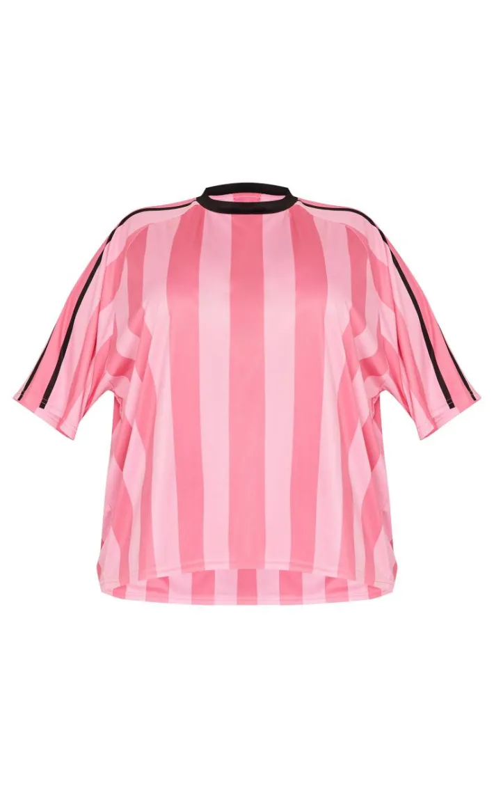 Add a pop of pink to your wardrobe with this plus pink striped oversized football t-shirt. It’s made with a pink striped fabric, oversized fit and crew neckline. What’s not to love? Let this football t-shirt do the talking by pairing with a denim skirt, heeled boots and a faux leather handbag.