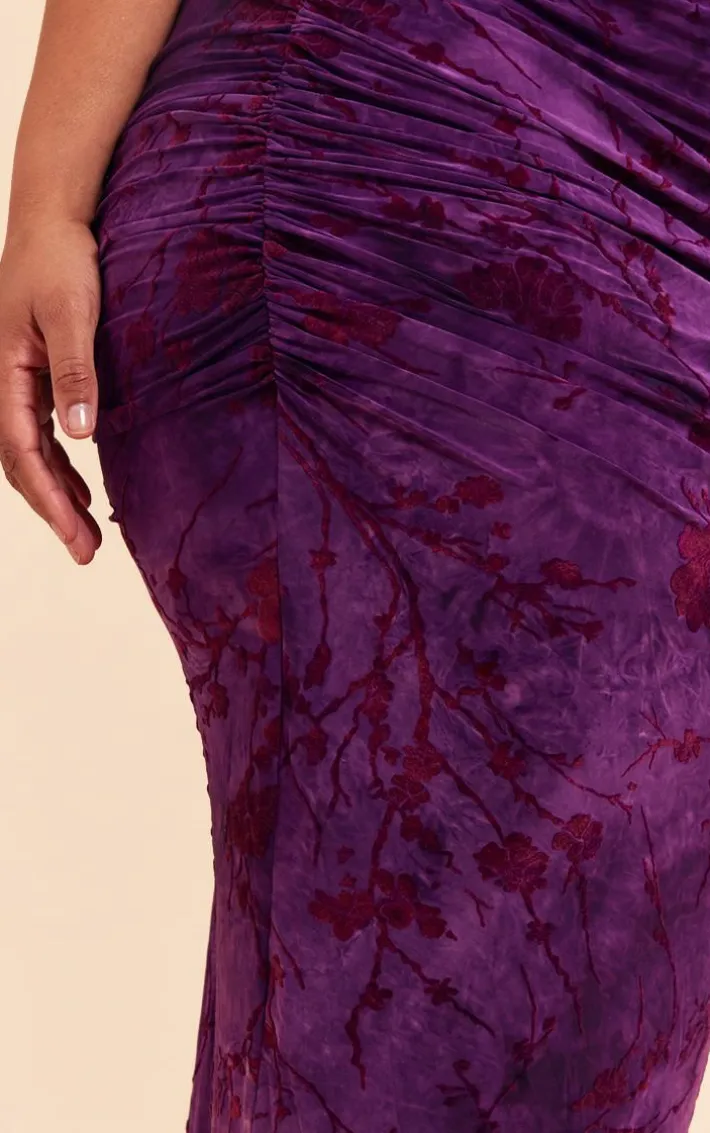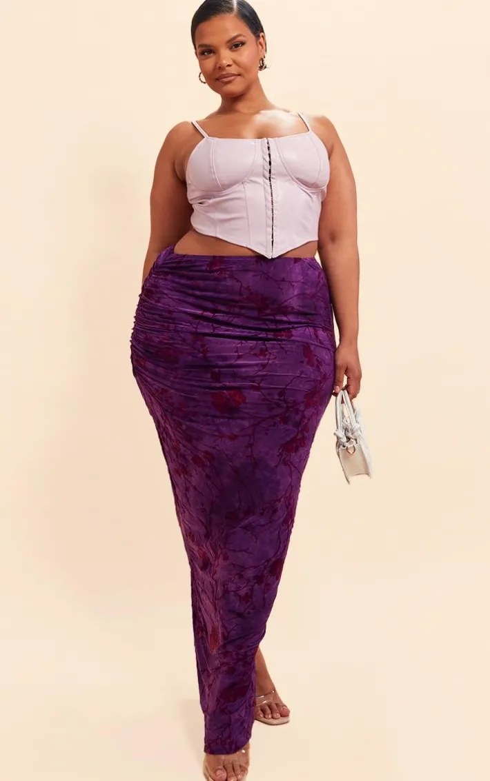 Add some drama into your weekend wardrobe with this plus purple soft touch devore ruched side maxi skirt. Brought to you in a purple soft touch material with a devore design and a ruched side, we are seriously obsessed. With It’s maxi length, you’re sure to have all eyes on you. To complete the look style with some mule heels and gold hoops for a date night look.