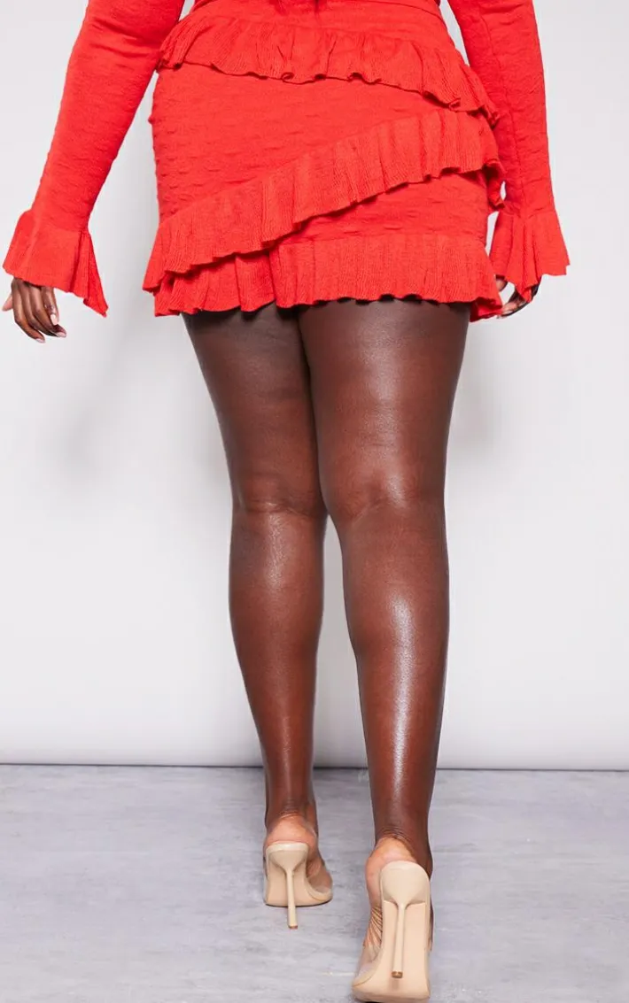 Add some fierce vibes into your weekend wardrobe with this plus red bubble knit frill detail mini skirt, we’re obsessed. This plus skirt features a red bubble knit material with frill detailing and a mini length, you’ll be adding it straight to your basket. Style this knit skirt with the matching top, clear heels and hoop earrings for a look everyone will be asking about.