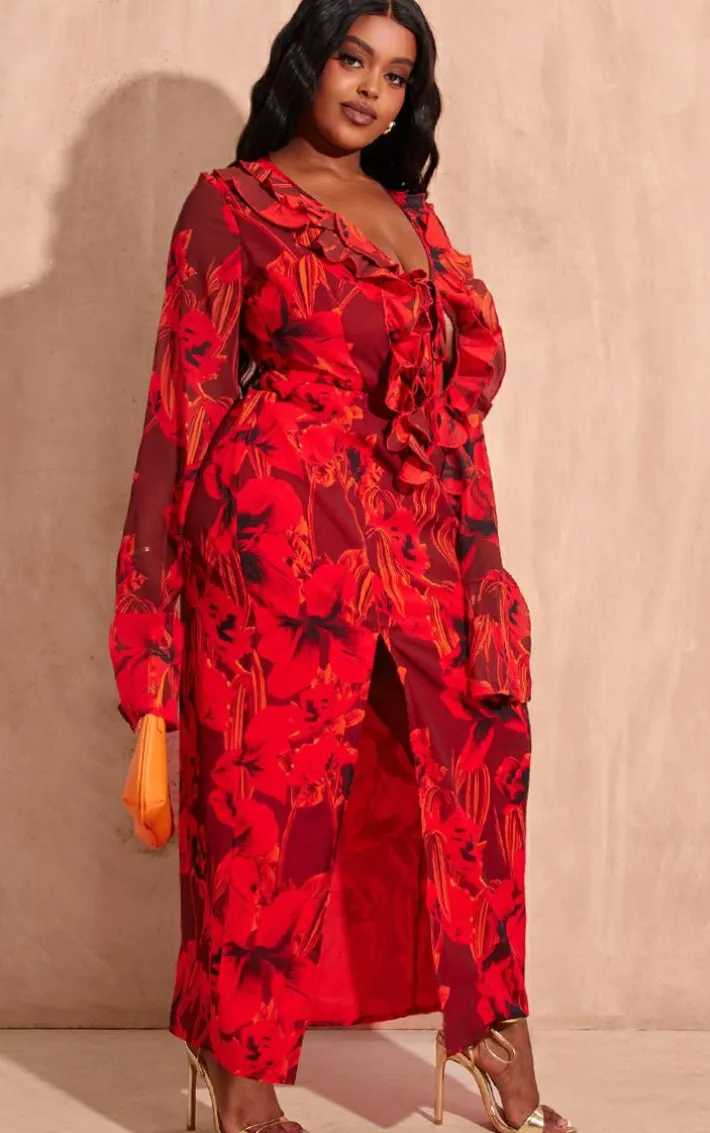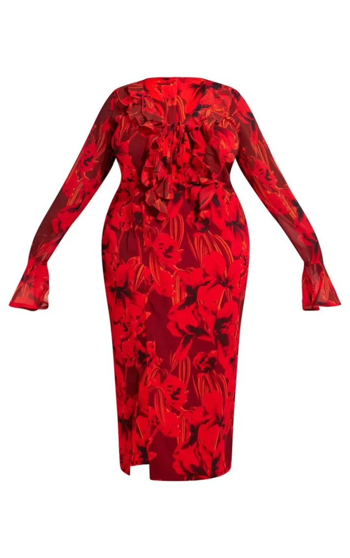 Have all eyes on you in this plus red floral print chiffon frill detail midi dress. Brought to you in a red chiffon material featuring a floral print with a frill detail and midi length, what’s not to like? Style this dress with gold heels and accessories for a figure-flattering fit we can’t get enough of.