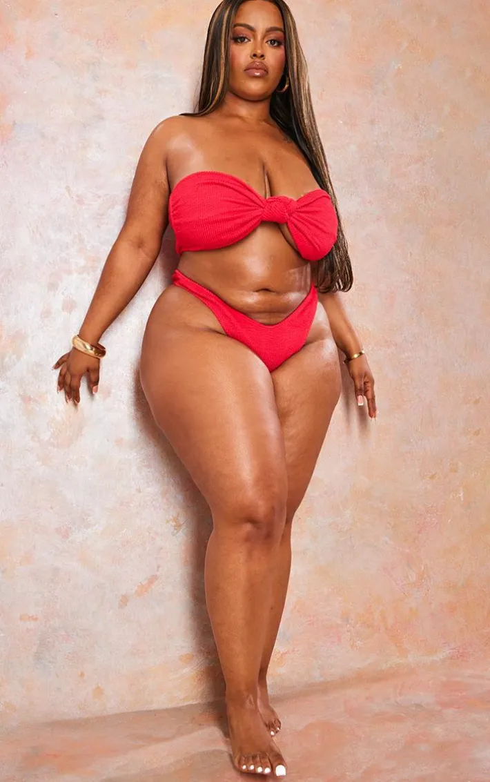 Dare to go bold this season with this plus red tie front ribbed bandeau bikini top, you won’t be able to resist. This plus bikini top is made using a red ribbed material with a tie front design and a bandeau style, what more could you ask for? Pair this bikini top with the matching bottoms and gold accessories for a flawless finish.