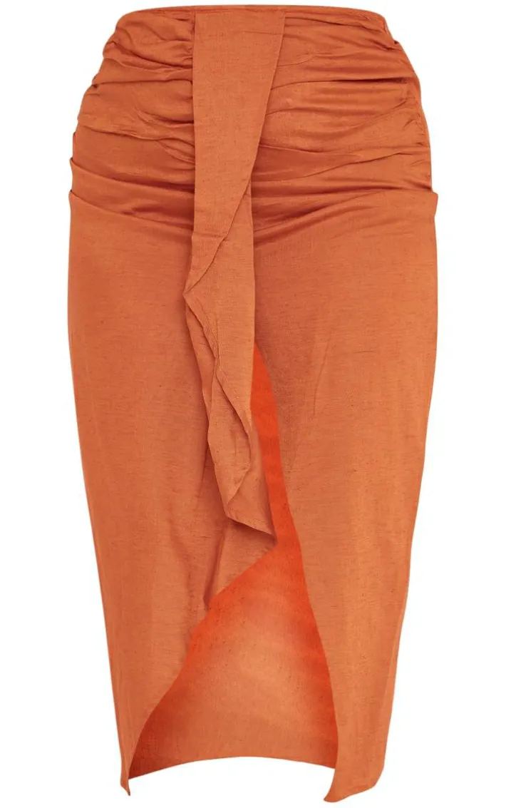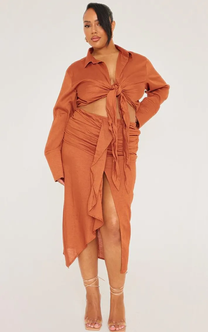 This plus rust linen look drape front midi skirt is here to banish any of your what to wear dilemmas. Brought to you in a rust linen look material with a drape front design, we can’tget enough. From start to finish this midi skirt will have you looking totally on-trend. For a next-level look simply style with the matching top and some slip on heels to make heads turn all season.