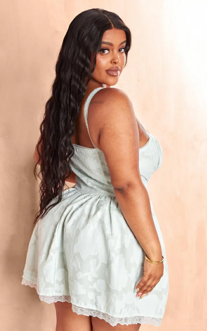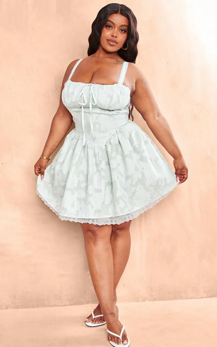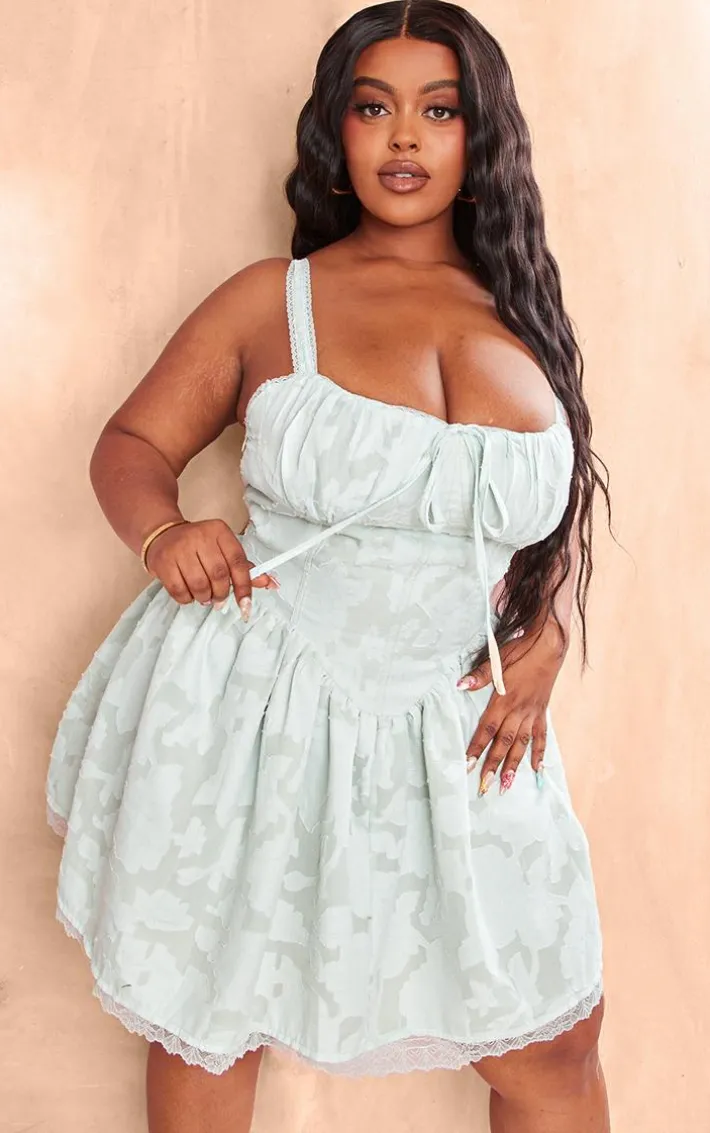 Go for all the glam vibes this season with this plus sage green jacquard ruched cup detail shift dress, we’re seriously in love. This plus dress features a sage greenhue jacquard material with ruched cup detailing and a flattering fit. Style this jacquard dress with slip-on heels, a mini bag and hoop earrings for a look that is perfect for your next special occasion.