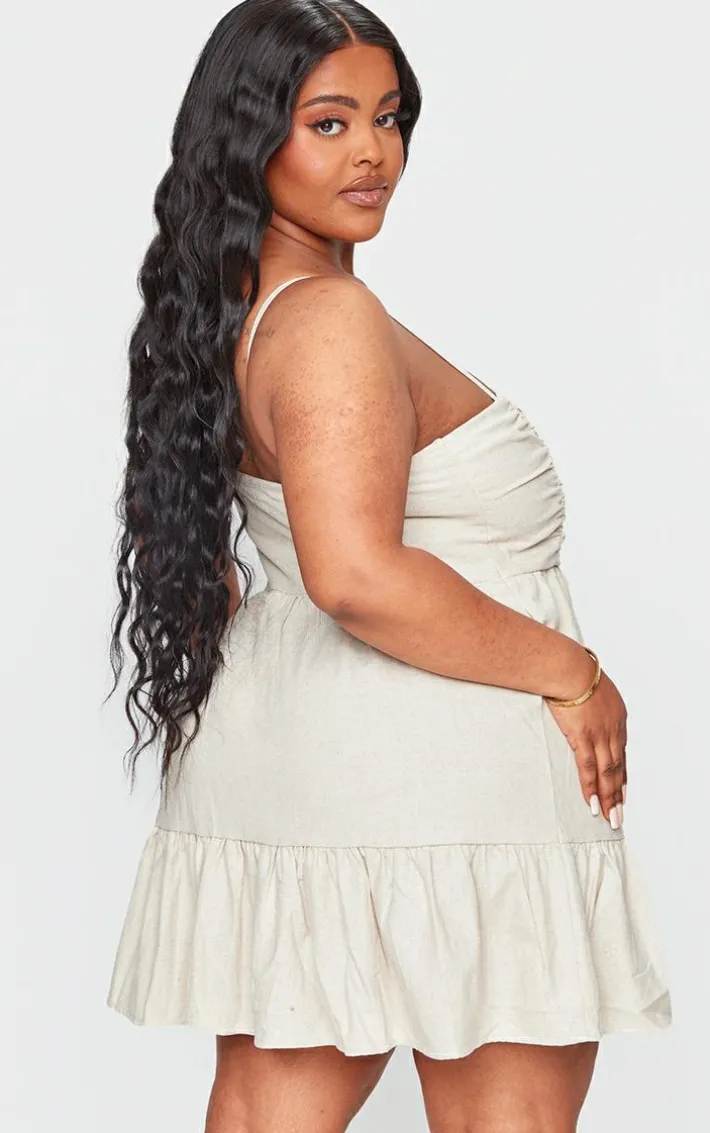 For an Insta worthy look, this plus stone linen ruched bust detail tiered hem mini is essential. This mini dress is brought to you in a stone linen material with a ruched bust detail and a tiered hem, giving you a flattering fit you won’t be able to resist. This mini dress will have you feeling edgy all season. Why not team with a statement bag and your fave heels to complete the look everyone is talking about.
